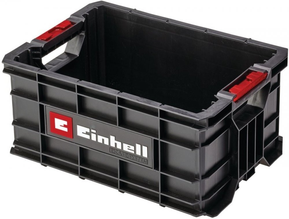 Einhell E-Case Werkzeugkiste je praktický a odolný úložný box pro ruční nářadí, příslušenství nebo spojovací materiál. Jedná se o součást modulárního systému Einhell E-Case, díky čemuž jej lze snadno kombinovat a stohovat s ostatními kufry této řady. Box je vyroben z robustního plastu, má kovové přezky a praktickou výsuvnou rukojeť. Uvnitř se nachází hluboký úložný prostor bez přepážek, vhodný pro větší i těžší předměty.