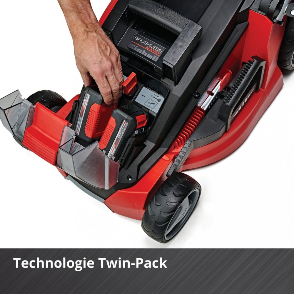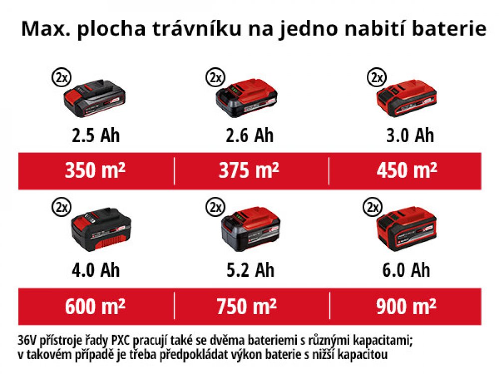 - Obsahuje dvě 18 V baterie o kapacitě 4 Ah, dvě nabíječky a mulčovací set
