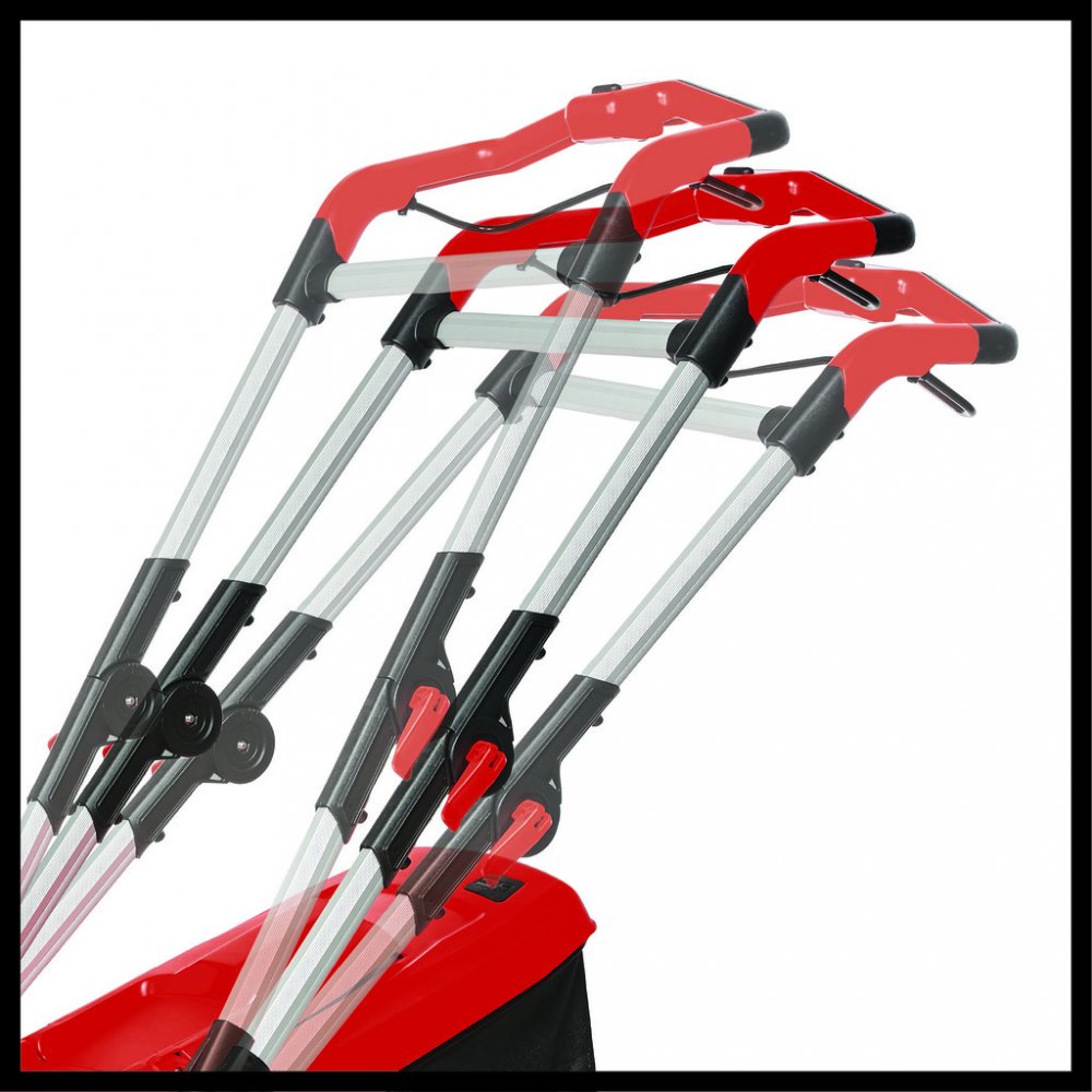 Eliminaci únavy při práci umožňuje ergonomicky tvarovaná oblast úchopu. Výškově nastavitelné madlo lze individuálně přizpůsobit uživateli. Aku sekačka je zároveň odolná a má lehké hliníkové madlo. Integrované držadlo zajišťuje snadnou přepravu. Madlo je sklápěcí, takže sekačka může být uložena i tak, aby se ušetřil prostor. Sběrný koš na trávu o kapacitě 45 litrů je vybaven ukazatelem naplnění. Sekačka má vysoká a široká kola, která jsou šetrná vůči trávníku. Součástí dodávky jsou baterie a systémová rychlonabíječka (Power X-Twincharger).