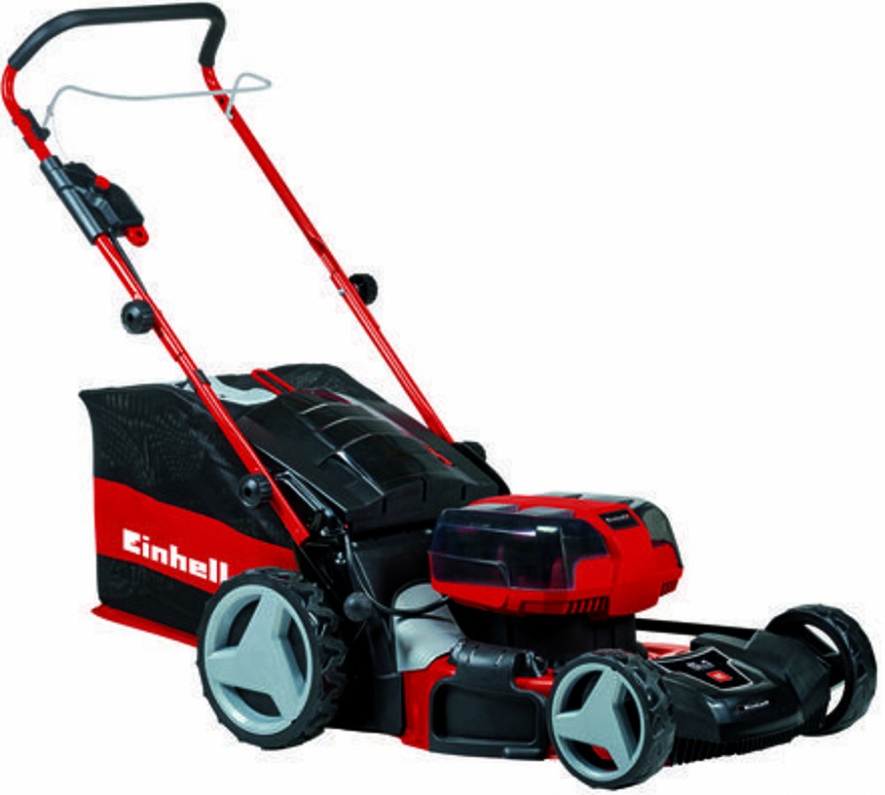 Einhell 47 cm 92.5 dB ocelové 30.5 kg s pojezdem akumulátorové rotační 75 l 700 m2 18 V 4 Ah elektromotor 3300 ot/min 65 mm 2 s plastovo-látkovým košem
