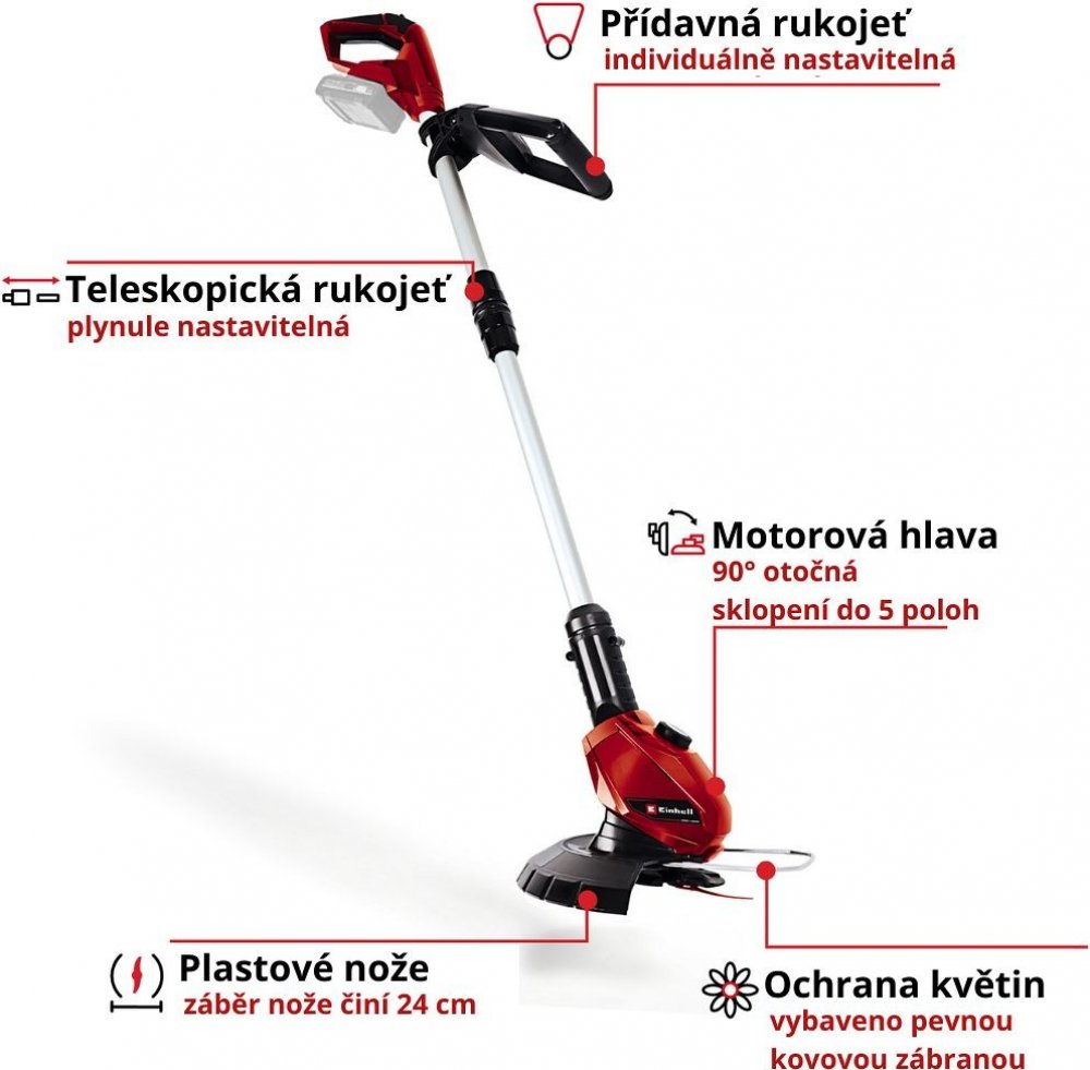 Einhell 1.8 kg 24 cm strunové sekačky (vyžínače) akumulátorové madla 8500 ot/min akumulátorový 18 V 78 dB bez aku