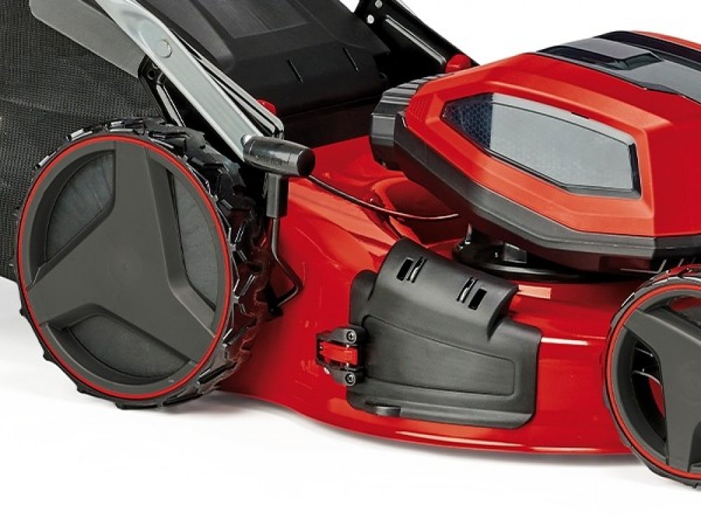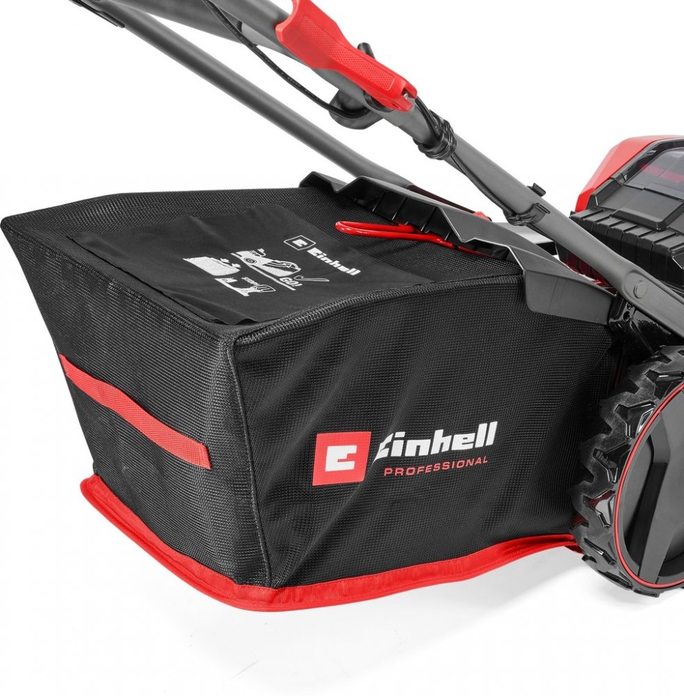 Einhell 52 cm 98 dB ocel 29.48 kg s pojezdem akumulátorové rotační 65 l 1200 m2 18 V 5.2 Ah elektromotor 3000 ot/min 80 mm s látkovým košem 87.8 x 59 x 43.5 cm 9