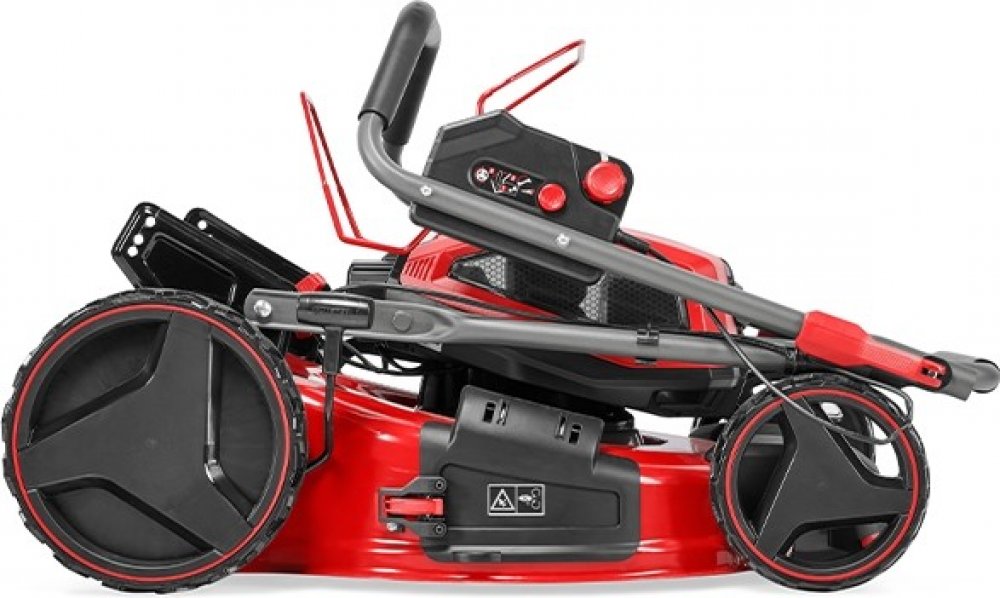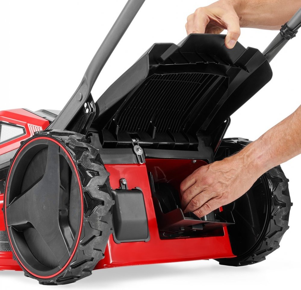 Rukojeť sekačky je výškově nastavitelná a skládací, což umožňuje přizpůsobení výšky uživateli a úsporné skladování. Zvýšená zadní kola a variabilní samočinný pohon usnadňují práci i v náročnějším terénu. Široká kola jsou navíc šetrná k trávníku a mini
