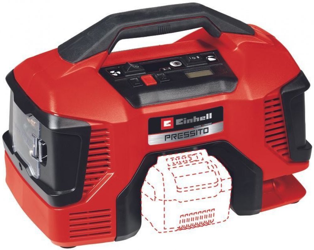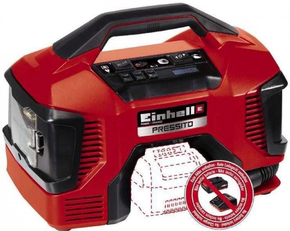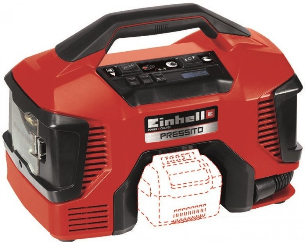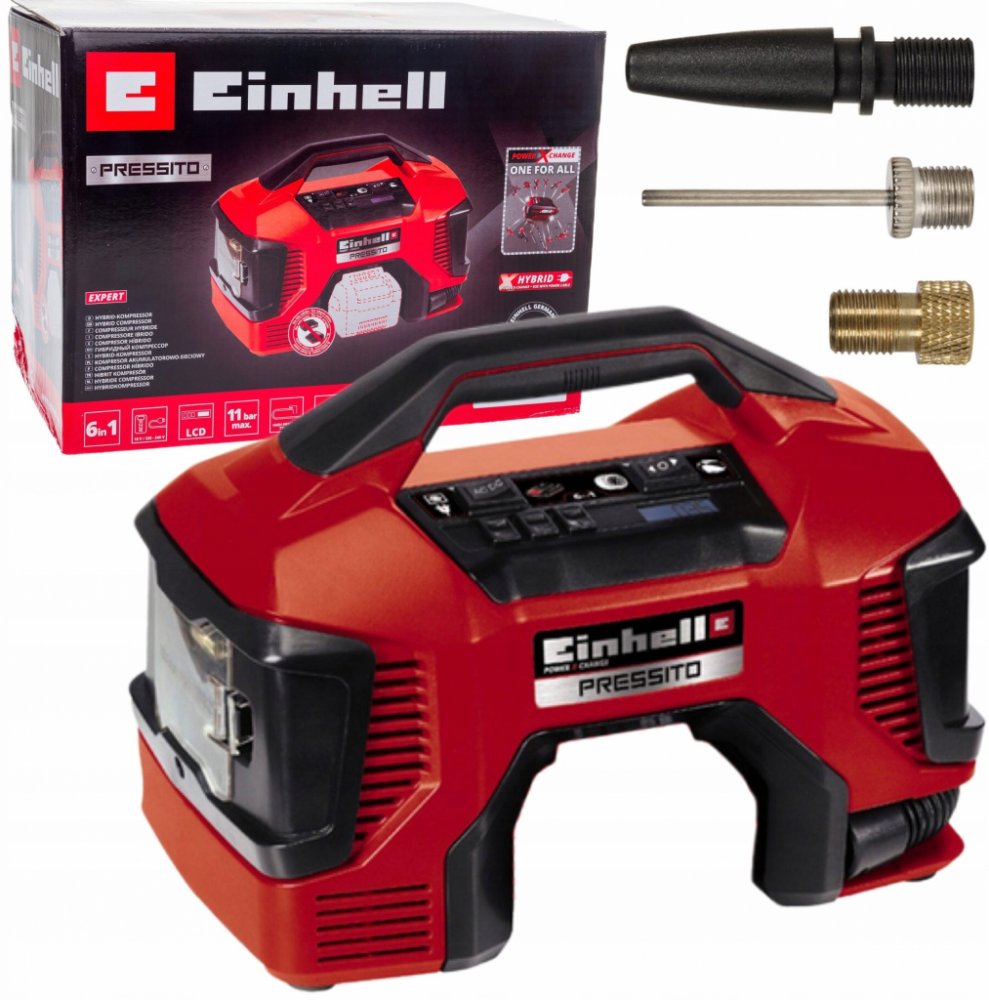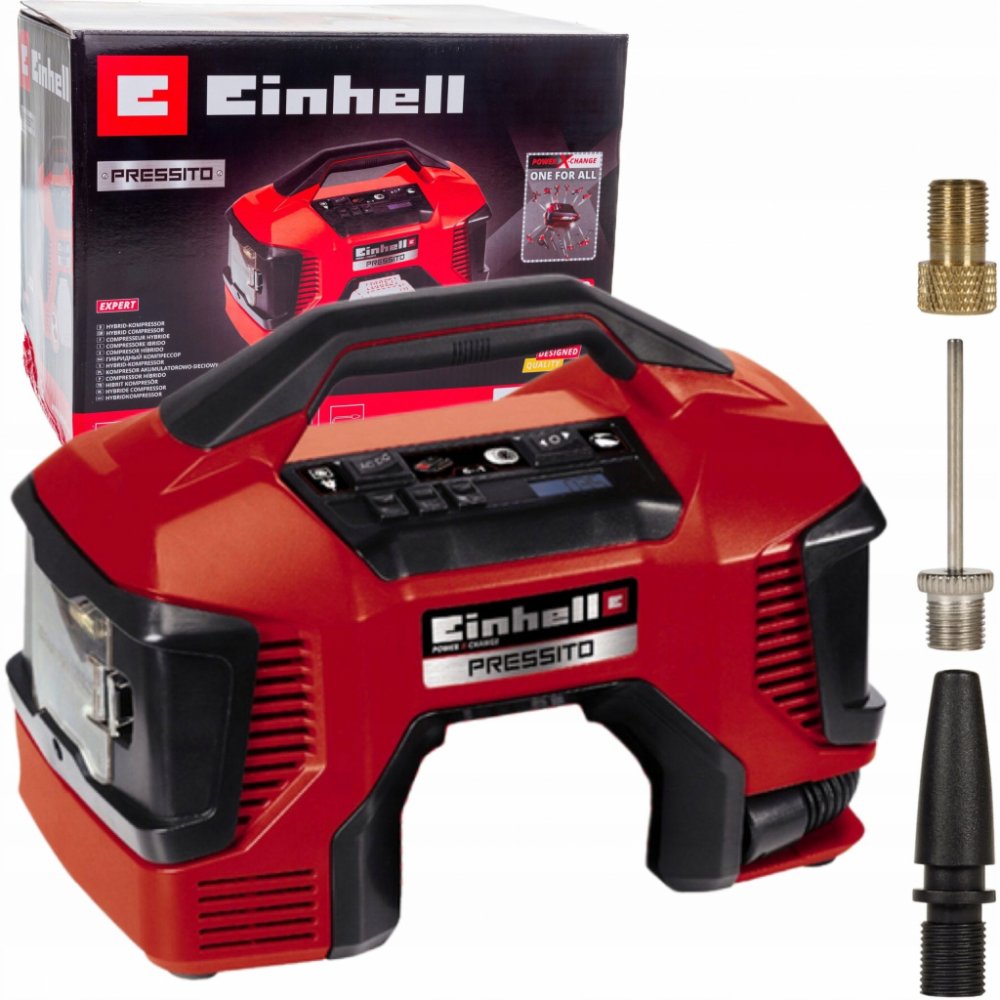 Pressito s vysokotlakým čerpadlem pro čerpání vzduchu do pneumatik pro automobily a kola je nejen ideálním doplňkem pro garáž, ale je také ideální pro použití i na silnici. V případě sportu je kompresor také praktickým pomocníkem pro nafukování koulí přímo tam, kde je akce. Vysokotlaké čerpadlo má maximální pracovní tlak 11 barů a může být uživatelem ručně přednastaveno. Funkce automatického vypnutí zajišťuje, že kompresor se po dosažení nastaveného tlaku zastaví. Nízkotlaké čerpadlo umožňuje, aby vzduchové matrace nebo gumové čluny byly nafouknuty bezprostředně a funkce nízkotlakého sání pomáhá rychle vyfoukat. Přepínání mezi vysokotlakým a nízkotlakým funkcím je zvoleno tlačítkem. K dispozici je také 3-dílná inflační sada s adaptéry pro pneumatiky pro automobily a cykly, pro fotbalové míče a basketbalové míče a pro vzduchové matrace a gumové čluny. Kabely a hadice pro hybridní kompresor se uchovávají přímo na nástroji, aby se nemohly ztratit. Hybridní kompresor má digitální displej s indikátorem tlaku a ruční ovládání je uživatelsky přívětivé. Kompaktní a lehký hybridní kompresor lze snadno uložit a díky nabíjecí baterii a praktické rukojeti lze také vzít do vozu. Výhody akumulátoru jsou zřejmé: díky nové generaci výkonných a dlouhotrvajících baterií Einhell nabízí multifunkční kompresor pohodlí mobilního použití. Baterie s vysoce kvalitními lithium-iontovými články mohou být také použity pro všechny členy rodiny Power X-Change, a to jak pro zahradu, tak pro segmenty nářadí. Nabíjecí baterie a nabíječky pro sortiment produktů Power X-Change jsou k dispozici samostatně.