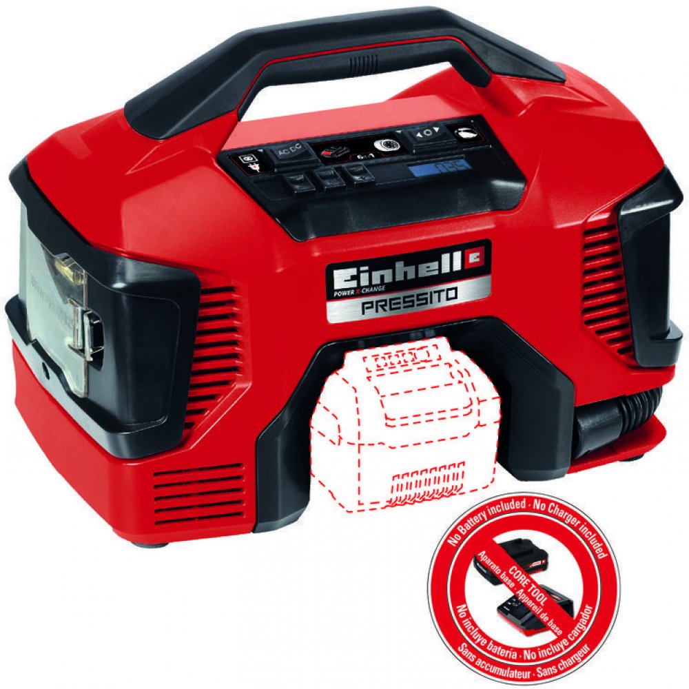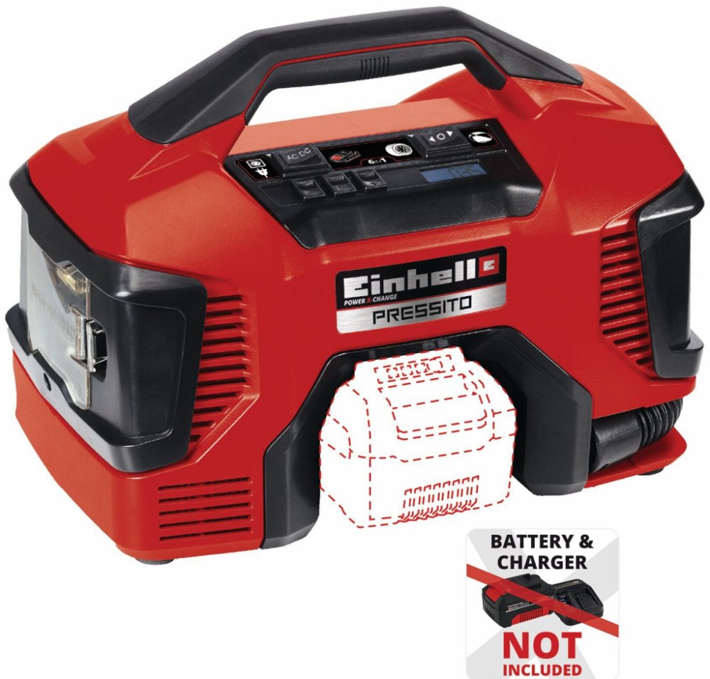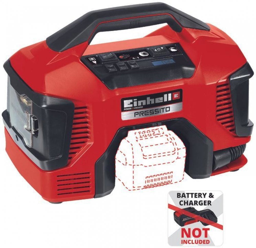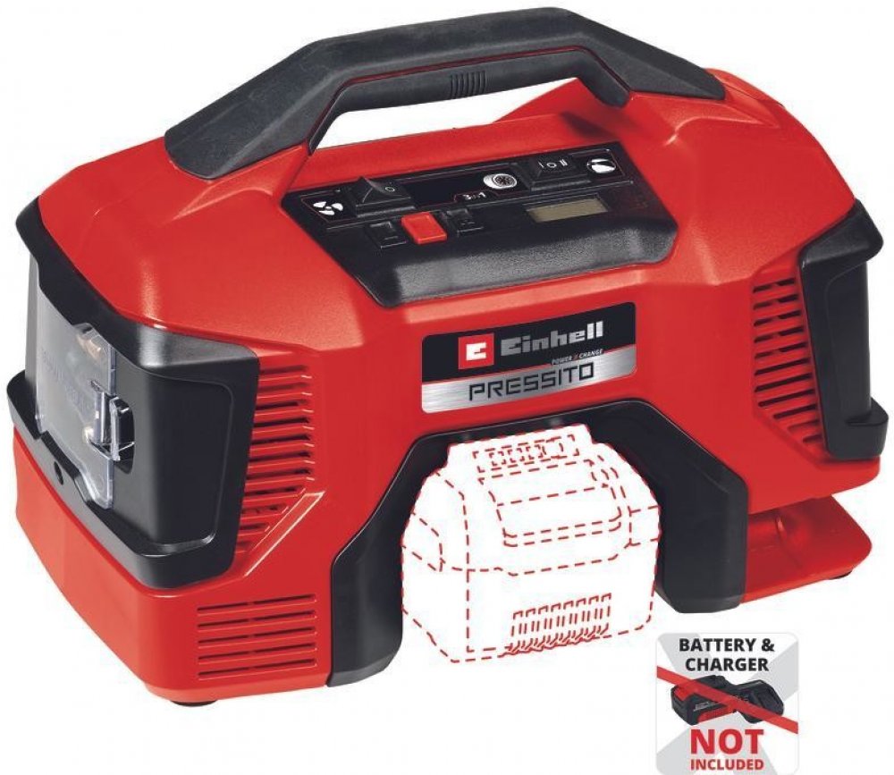 Pressito s vysokotlakým čerpadlem pro čerpání vzduchu do pneumatik pro automobily a kola je nejen ideálním doplňkem pro garáž, ale je také ideální pro použití i na silnici. V případě sportu je kompresor také praktickým pomocníkem pro nafukování koulí přímo tam, kde je akce. Vysokotlaké čerpadlo má maximální pracovní tlak 11 barů a může být uživatelem ručně přednastaveno. Funkce automatického vypnutí zajišťuje, že kompresor se po dosažení nastaveného tlaku zastaví. Nízkotlaké čerpadlo umožňuje, aby vzduchové matrace nebo gumové čluny byly nafouknuty bezprostředně a funkce nízkotlakého sání pomáhá rychle vyfoukat. Přepínání mezi vysokotlakým a nízkotlakým funkcím je zvoleno tlačítkem. K dispozici je také 3-dílná inflační sada s adaptéry pro pneumatiky pro automobily a cykly, pro fotbalové míče a basketbalové míče a pro vzduchové matrace a gumové čluny. Kabely a hadice pro hybridní kompresor se uchovávají přímo na nástroji, aby se nemohly ztratit. Hybridní kompresor má digitální displej s indikátorem tlaku a ruční ovládání je uživatelsky přívětivé. Kompaktní a lehký hybridní kompresor lze snadno uložit a díky nabíjecí baterii a praktické rukojeti lze také vzít do vozu. Výhody akumulátoru jsou zřejmé: díky nové generaci výkonných a dlouhotrvajících baterií Einhell nabízí multifunkční kompresor pohodlí mobilního použití. Baterie s vysoce kvalitními lithium-iontovými články mohou být také použity pro všechny členy rodiny Power X-Change, a to jak pro zahradu, tak pro segmenty nářadí. Nabíjecí baterie a nabíječky pro sortiment produktů Power X-Change jsou k dispozici samostatně.