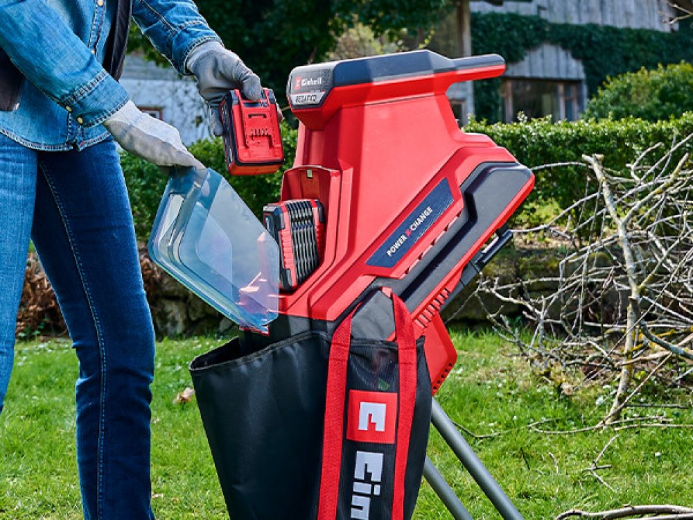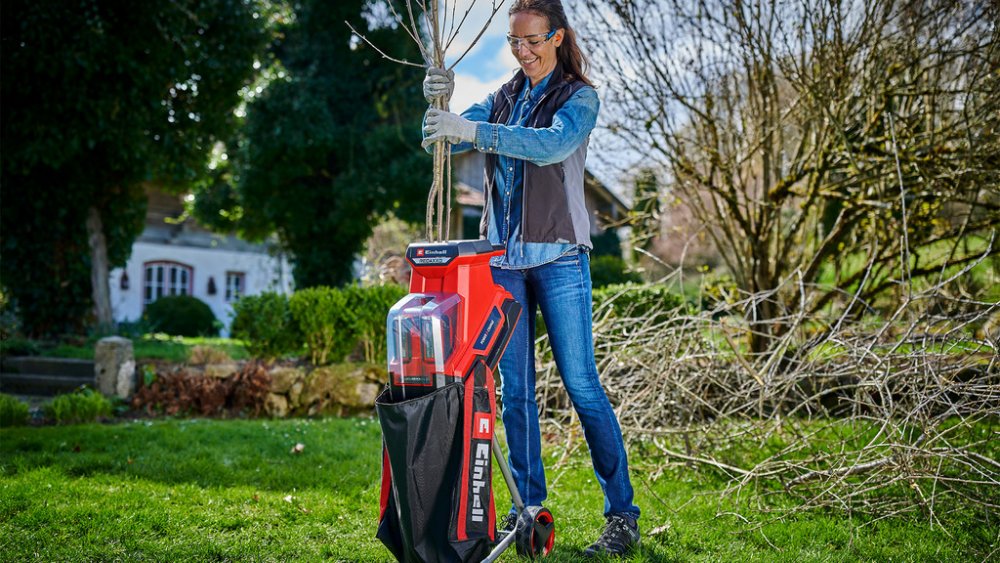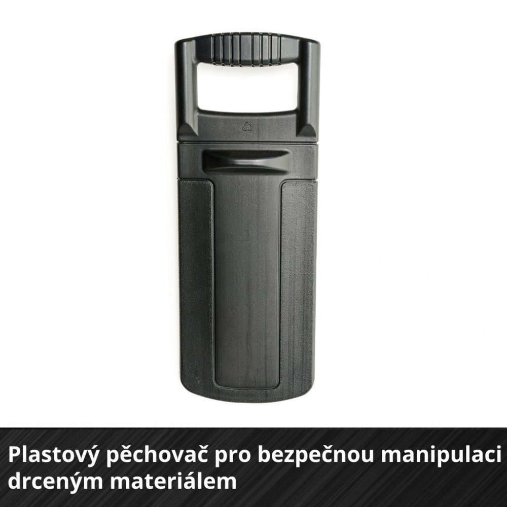 Maximální výkon zajišťuje technologie 36 V Twin-Pack, která kombinuje výkon dvou 18 V akumulátorů. Pro dosažení optimálního výkonu se doporučuje používat baterie s kapacitou 5,2 Ah nebo vyšší. Během používání jsou baterie chráněny před nečistotami, deštěm a nárazy pomocí výklopného krytu baterií. Ať už se jedná o suché, tvrdé větve nebo zahradní odpad, jako je listí, keře nebo ostříhané živé ploty. Díky velkému trychtýřovému otvoru a přiloženému pěchovači lze snadno a bezpečně podávat větve o maximálním průměru 25 mm. V závislosti na materiálu je pak nadrcený odpad vhodný ke kompostování nebo jako mulč. Přiložený pěchovač je díky integrovanému držáku vždy po ruce. Součástí dodávky je také kvalitní pytel o objemu 55 litrů, který lze snadno zavěsit do háčků na těle drtiče. Akumulátorový drtič je mimořádně mobilní díky robustnímu podvozku s kolečky a integrovanému transportnímu madlu. Pro snadné čištění a údržbu je drtič vybaven výklopným systémem s bezpečnostním zámkem. Díky tomu lze snadno uvolnit ucpávky, nebo vyměnit opotřebované oboustranné nože ze speciálně upravené oceli.