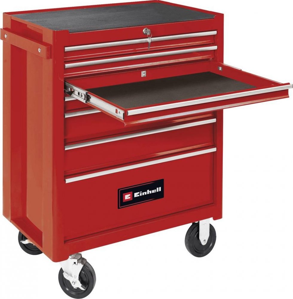 Vozík na nářadí TC-TW 150 je ideální pro udržení pořádku v dílně, hobby místnosti nebo garáži. Sedm zásuvek s kuličkovými ložisky, které lze zcela vysunout na svých teleskopických kolejnicích, udrží všechny potřebné nástroje na dosah ruky. Všechny zásuvky mají také protiskluzové vložky a lze je uzamknout. Praktický vozík pojme díky robustnímu rámu z ocelového plechu zatížení až 150 kg. S protiskluzovou pracovní deskou se na vozíku pohodlně pracuje. Čtyři velká kola s hladkým chodem, z nichž dvě jsou řiditelná a mají parkovací brzdu, umožňují velmi snadný a pohodlný přesun vozíku. Z bezpečnostních důvodů je vozík na nářadí vybaven výsuvnými zarážkami zásuvek, aby se zabránilo otevření několika zásuvek současně. ➤ Vlastnosti *7 kuličkových ložisek, plně výsuvné a stabilní zásuvky *S funkcí zamykání *Protiskluzové vložky ve všech zásuvkách a na pracovní desce *Stabilní rám z ocelového plechu pro dlouhou životnost *74 velká kola s hladkým chodem (2 z nich mají blokovací brzdu) *Nosnost: max. 150 kg *Stabilní konstrukce: přední, zadní a boční stěny o šířce 1,0 mm *Blokovací systém zabrání překlopení: lze otevřít pouze 1 zásuvku