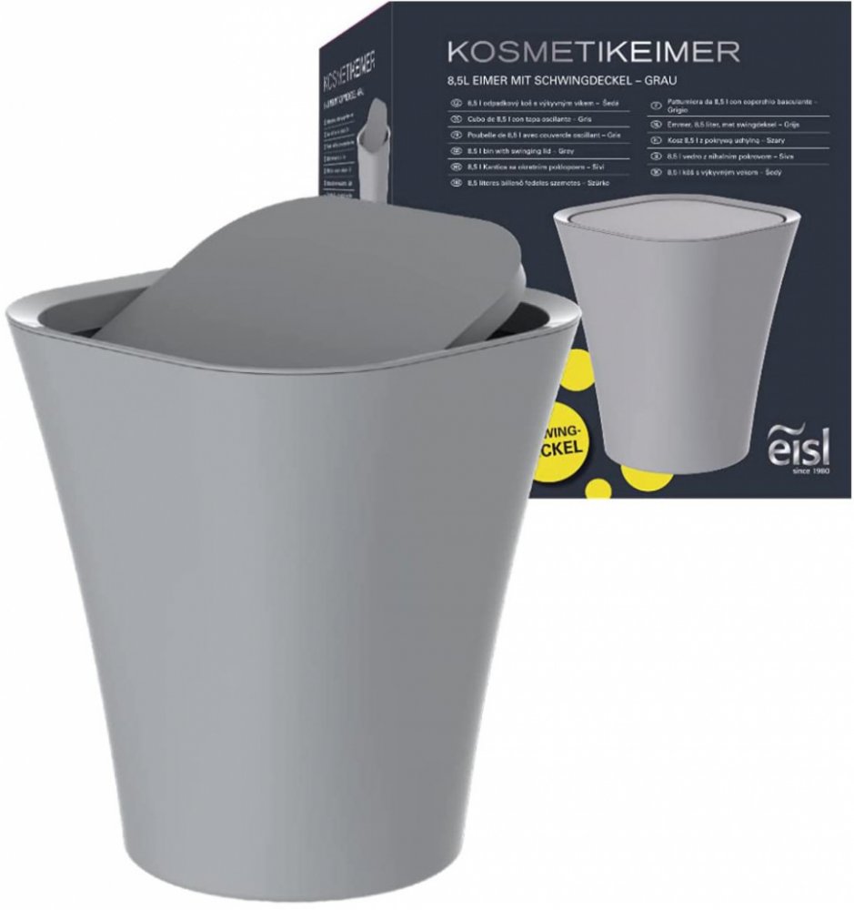 Kosmetický koš EISL šedý - BA0301Odpadkový koš o objemu 8,5 litru od společnosti EISL se skvěle hodí do každé koupelny.Koupelnový odpadkový koš má výklopné víko pro hygienický provozKoš je vyroben z plastu, a proto je vhodný zejména do vlhkých místností. Matný šedý povrch se snadno čistí. Skvrny jsou méně nápadné než u chromovaného nebo lesklého koupelnového odpadkového koše.Technické údaje: Koš n...
