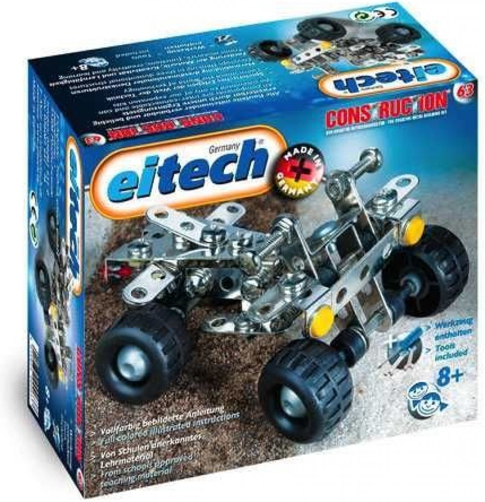 S kovovou konstrukční stavebnicí Eitech děti hravě objevují svět techniky. Malí i velcí tak mohou stavět modely aut, jeřábů, letadel a mnohých dalších strojů. Jednotlivé sady se vzájemně doplňují a lze je kombinovat. Konstrukční stavebnice C63 (25-5362) obsahuje 107 kovových dílků a ilustrovaný návod na složení modelu čtyřkolky. Kompatibilní s dalšími sadami Eitech.