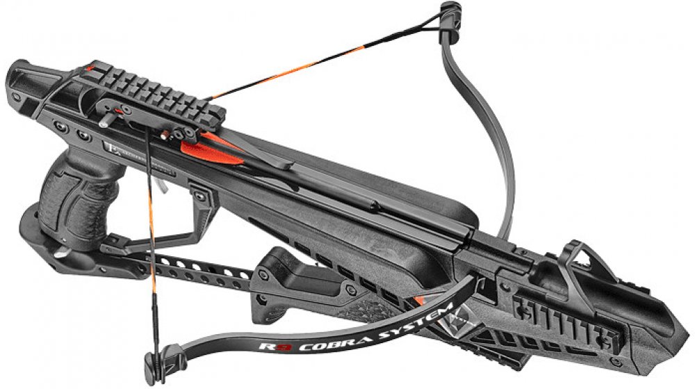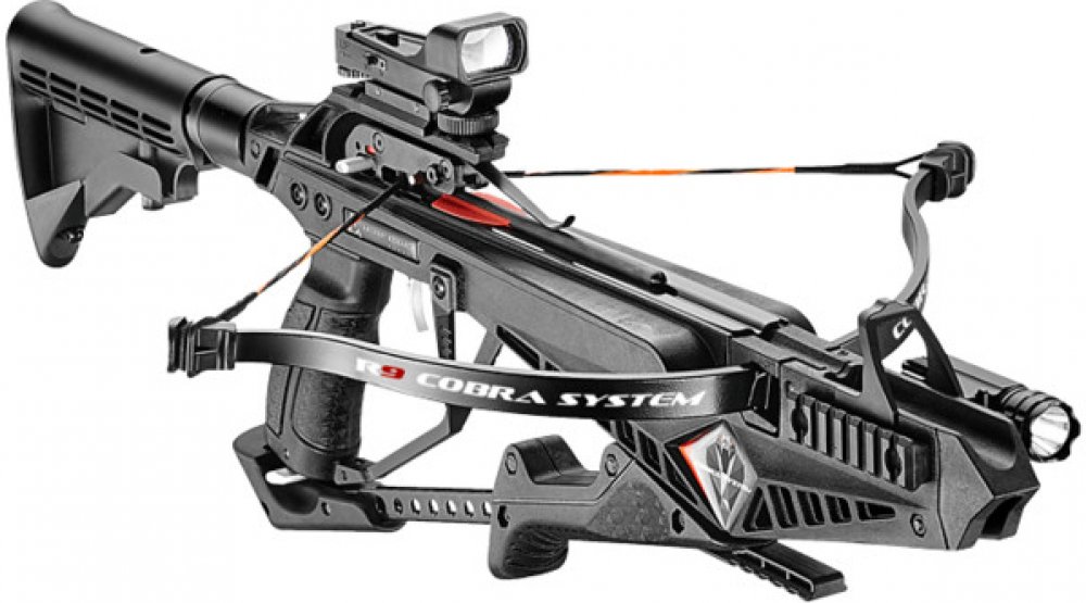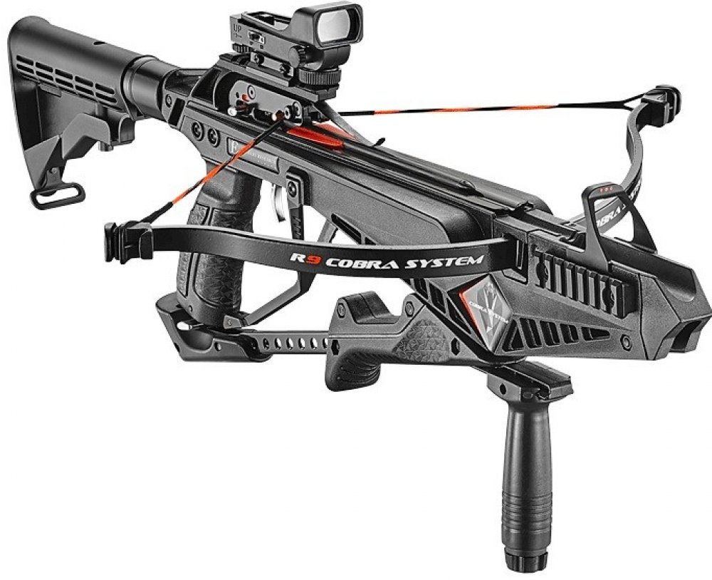 R9 Cobra systém:Rychlý střelec manipulující touto karabinový kuší používá integrální (napínací) páku. Silový nátah Cobry R9 v délce 7,5 "(19.05 cm) s výstřelem vyhrazeným 155 grainovým 7,5" karbonovým šípem s úsťovou rychlostí 240 fps, téměř dvojitá kinetická energie tradičního pistolového šípu!Lučiště s 90 lbs může být rychle odstraněny a odinstalované bez nářadí, takže kuše může být kompaktně sk...