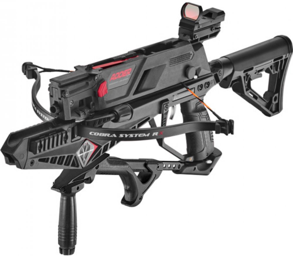 Cobra systém RX ADDER verze 2.0:Rychlý střelec manipulující touto karabinovou kuší používá integrální (napínací) páku. Silový nátah Cobry RX v délce 7,5“ (19.05 cm) s výstřelem vyhrazeným 7,5“ karbonovým šípem má rychlost střely až 270 fps, což je přibližně 82 m/s.Lučiště se 130 lbs může být rychle odstraněno a odinstalováno bez nářadí, takže kuše může být kompaktně skladována v kufru nebo tašce. ...