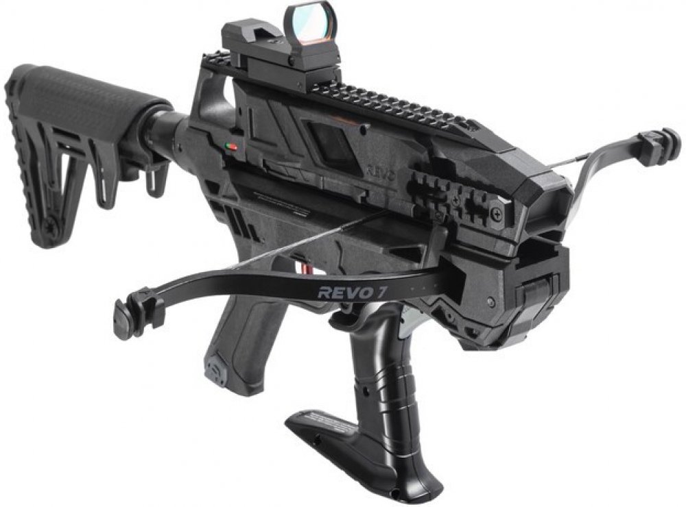 Revoluční číslo od Ek-Archery - více ranová hybridní kuše REVO 7, která vyšla koncem roku 2024. Její výkon je závislý na použitých ramenech a při lučišti o síle 90 lbs má rychlost šípu 235 fps – 71,63 m/s. Celková hmotnost kuše je 3,10 kg.Zásobník a možnosti:Tato kuše má primární zásobník na 7 specifických karbonových šípů se značením REVO 7 s délkou 6,3“. Zásobník je rychle odnímatelný a vsouvá se z bočních stran do těla zbraně pouhým kliknutím. Design kuše REVO 7 mění koncept opakovacích zbraní, neboť výrazně zrychluje střelbu možností výměny prázdného zásobníku za další nabitý. Zásobník je ve středu transparentní a indikuje tak kapacitu šípů. Dokonce obsahuje pružinu šípu, která slouží jako ADF pojistka - anti výstřel na prázdno. Po posledním výstřelu zachytí ve proti směru tětivu a střelec tak neumí kuši napnout bez šípu.Rychlosborka a upgrade:REVO 7 vychází z konceptu série R9, celá zbraň se dá snadno rozložit za pomoci integrovaných pinů. Tato jednoduchá rozborka umožňuje převážet kuši v bezpečném stavu. Lučiště má v této standardní výbavě napínací sílu 90 liber. Je možné jej modulovat s dostupnými lučišti o výkonu 30lbs, 60lbs nebo dokonce 120 lbs.Design ve stylu:Něco mezi samopalem a větší pistolovou kuší. REVO 7 Má ergonomicky navržený rám a pistolové uchopení s taktickou pažbou ve stylu AR. Zadní pažba je ergonomicky tvarovaná, výsuvná s výškově nastavitelnou lícnicí. Kuše REVO 7 má délku se zasunutou pažbou 58 cm. Při maximálním vysunutí pažby se kuše prodlužuje o cca 10 cm. Materiál zbraně je z odolného polymeru a napínací páka je kovová. V designu je integrován i otvor pro zámek spouště, takto můžete předejít nechtěnému použití zbraně například mladším členům rodiny.Napínání:Napínání kuše je velmi intuitivní. Dobře umístěná pojistka pro odemknutí napínací páky umožňuje její odemknutí a rychlý pohyb vpřed, tím se pohne celý spoušťový mechanismus a zachytí tětivu. Napínací páka je masivní a dobře přebírá těžiště pro stabilitu, držení zbraně a současně opakovaný pohyb napínání tětivy. Spoušť má hladký chod s odporem 3,5 liber.Inovace v pojistce:Inovace je i v pojistném mechanismu ve tzv. módu 1 nebo AUTO, což znamená že střelec si umí navolit, zda chce použít bezpečnostní pojistku proti výstřelu nebo ne. Zvolí-li na přepínači AUTO, může tak kontrolovaně zrychlit celý cyklus střelby, protože po napnutí lze hned stisknout spoušť a vystřelit. Zůstane-li přepínač na pozici – 1, střelba je v režimu klasického cyklu, po každém napnutí je nutné odjistit automatickou pojistku proti nechtěnému výstřelu.REVO 7 a kompatibilita:Tato kuše je osazena Picatinny lištami pro dodatečné taktické doplňky jako laser, optika, svítilna a jiné příslušenství. V přední části zbraně jsou dvě Picatiny lišty zatímco na vrchní části je hlavní kovová montážní Picatinny lišta s extra délkou až do 25 cm. Tato maxi lišta obsahuje i pevná mířidla, v přední části je muška a vybrání drážek zadní části slouží jako cílník. Pictainny lišta je však určena především pro optiku a duralový kolimátor je i obsahem balení.Vybíjecí klíč:V pažbě je ukryt jedinečný vybíjecí klíč, kterým můžete uvolnit spoušťový mechanismus a uvolnit tětivu bez nutnosti vystřelení šípu jako je tomu obvykle u jiných kuší.Obsah balení a varování:V tomto balení naleznete standardní lučiště o síle 90 lbs, karbonové šípy REVO 7 – 7 x, duralový kolimátor, zadní teleskopickou pažbu, nastřelovací tětivu, náhradní tětivu, pár koncovek lučiště, mazivo na kolejnice.Nepoužívejte jiné šípy než originál Ek-Archery REVO 7. Šípy jiných výrobců mají odlišnou váhu, průměr a mohou způsobit podstřelení, výstřel naprázdno a následně poškození zbraně.Doporučujeme si zakoupit kvalitní vosk na tětivu, důsledným a pravidelným mazáním tětivy voskem předejdete jejímu opotřebení a výrazně tak zvýšíte její životnost.Kuše opakovací Ek-Archery REVO 7,90 lbsZásobník REVO 7Lučiště 90 lbsŠípy karbonové REVO 7, 6,3" - 7 ksNáhradní tětivaNastřelovací tětivaDuralový kolimátorZadní teleskopická pažbaLubrikant na kolejniceSet koncovek na lučištěNávod se záručním listemNapínací síla: 90 liberSystém: opakovacíRychlost šípu: 235 fps - 71,63 m/s (142 gr)Kapacita zásobníku: 7 šípůKompatibita šípů: výhradně šípy REVO 7Materiál těla: odolný polymerRychlosborka a upgrade s REVO příslušenstvímOdpor spouště: 3,5 lbsŠířka lučiště: 43,5 cmPojistka: automatickáBezpečnost: pojistka na napínací páce a otvor pro zámek na spoušťADF - anti dry fire mechanismus v zásobníkuChránič prstů v designu tělaVybíjecí klíč uložený v rukojetiRežim střelby: 1 - AUTOMontážní lišty Picatinny: 3xZadní pažba typ AR - výsuvná s nastavitelnou lícnicíCelková délka se zasunutou pažbou: 58 cmCelková délka s vysunutou pažbou: 59 cmPevná mířidla integrovaná na Picatinny lištěDuralový kolimátor s červeným bodemCelková hmotnost: 3100 gramůBarva: černáVýrobce: Ek-Archery