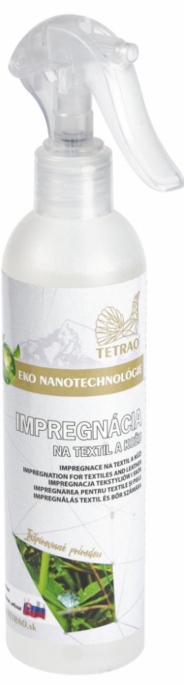 Vhodná pro impregnaci téměř všech druhů textilií Vytváří neviditelný ekologický nano nátěr Odpuzuje vodu a nečistoty z obuvi a oděvů TETRAO Nanometrická impregnace obuvi, textilu, oděvu a kůže. Tato vysoce kvalitní ekologická impregnace je vhodná pro impregnaci téměř všech druhů neimpregnovaných textilií, pravé i umělé nelakované a broušené kůže. Účinná impregnace odpuzuje vodu z bot, oděvů a textilu všech druhů látek včetně stanů, čímž chrání jejich strukturu. Přípravek tvoří neviditelný ekologický nano nátěr pokrývající povrch, který chrání vaši obuv či textil před znečištěním a vodou. Povrch je odolný vůči vodě, bahnu, sněhu, silniční soli a jiným nečistotám. Materiál odpuzuje molekuly vody, čímž výrazně prodlužuje životnost materiálu a čas mezi čistícími procesy. Narozdíl od klasických metod impregnování oblečení a obuvi, nano impregnování nepracuje na úrovni molekul, ale na atomární úrovni. Využívá totiž efektu lotosového květu, který zajišťuje mnohem účinnější, odpuzující efekt a samočistící vlastnosti. Impregnace vytváří kolem vláken ošetřeného materiálu neviditelný ochranný film, který je mnohem odolnější než po běžné impregnaci. Navíc zůstává prodyšný, díky čemuž chráněný materiál dýchá a neplesniví. Nohy se nepotí, protože impregnace odpuzuje pouze kapaliny, ale vzduch propouští. Tím je zaručena prodyšnost celého materiálu. Nano impregnace obuvi má výrazně vyšší odpuzující schopnost proti vodě (nepromokavost) i nečistotám a také několikanásobně delší životnost. Kromě účinné ochraně zajistí impregnace i jistotu před vznikem nečistot. Ať už jde o turistiku, náročné pracovní podmínky, nebo chůzi po městě v tajícím sněhu. Díky zmíněným vlastnostem nano impregnaci velmi oceníte tam, kde začínají mít běžné impregnace na boty problém. Délka životnosti impregnace samozřejmě závisí na tom, jakým způsobem obuv používáte, ale účinnost tohoto nano produktu se pohybuje v řádu týdnů až měsíců, zatímco účinnost běžné impregnace klesá již po pár dnech. Nano impregnaci NanoConcept doporučujeme pro všechny druhy bot. Od společenské obuvi, přes vycházkovou až po outdoorovu nebo pracovní obuv. Proto můžete impregnaci bez obav aplikovat na jakýkoli materiál obuvi: textilní látka, kožená obuv, nubuk, outdoor, umělá kůže, broušená kůže, semiš, gore-tex Proč si koupit nano impregnaci na obuv a textil? Impregnovaná obuv extrémně odpuzuje kapalinu Několikanásobně delší životnost oproti běžné impregnaci obuvi Materiál boty dýchá, nezatuchne a neplesniví Impregnační vrstva je neviditelná a odolná proti mechanickému setření Produkt vyvinutý speciálně pro impregnaci textilu a kůže Velmi ekologický způsob impregnace bot a obuvi Přípravek je bezbarvý a při aplikaci neobtěžuje zápachem Návod k použití:Před ošetřením povrch důkladně očistěte (doporučujeme použít Aktivní čistící pěnu TETRAO nebo Univerzální čistič TETRAO). Upravený povrch by měl být čistý, suchý, odmaštěný. Před použitím přípravek protřepejte po dobu asi 10 vteřin a rovnoměrně nastříkejte na požadovaný povrch ze vzdálenosti asi 15-20 cm, dokud nenavlhne. Proces sušení trvá cca 60 minut. Impregnujte při teplotě 5-30°C. Po přibližně 12 až 24 hodinách je povrch plně funkční a umožňuje delší dobu trvanlivosti nanesené impregnace. Přesný technologický postup pro průmyslové používání dodává výrobce na požádání. UPOZORNĚNÍ:Pokud si nejste jisti, zda již materiál byl impregnován, přípravek je nutno vyzkoušet na malém kousku povrchu materiálu z vnitřní strany oděvu nebo obuvi. Pokud existuje pochybnost o tom, že materiál byl předem impregnován, výrobek by se měl nejprve vyzkoušet. Pokud se na materiálu objeví bílý povlak – nepoužívejte přípravek, protože to znamená, že materiál již byl impregnován. Pokud se při impregnaci povrchu objeví bubliny, opatrně je odstraňte bavlněnou nebo papírovou utěrkou (neotírejte). Produkt je určen k přímému použití. Neřeďte jej ani nemíchejte s jinými látkami! Skladování:Uchovávejte mimo dosah dětí. Držte mimo otevřený oheň. Případný zbývající obsah zneškodněte jako nebezpečný odpad. Přenos a skladování je možné pouze v originálním balení. Recyklujte pouze prázdné obaly. Po otevření výrobek skladujte v původních obalech nejdéle 6 měsíců. Bezpečnostní opatření:Při práci s přípravkem dodržujte běžná bezpečnostní opatření jako při práci s chemickými přípravky. Obsahuje lehce zápalné látky. Vysoce hořlavý. Během aplikace přípravku nesmí být v blízkosti otevřený oheň. Uchovávejte obal těsně uzavřený mimo dosah zdrojů zapálení. Zákaz kouření. Při práci zajistěte dostatečné větrání. Dráždí oči. Páry mohou způsobit ospalost a závrať. Zamezte styku s kůží a očima. V případě kontaktu s pokožkou opláchnout s větším množstvím vody. V případě kontaktu s očima vymýt s velkým množstvím čisté vody a vyhledat lékařskou pomoc. V případě spolknutí nezpůsobujte zvracení, ale požijte větší množství vody a ihned vyhledejte lékařskou pomoc. Uchovávejte mimo dosah dětí. Datum spotřeby: uveden na obaluVydatnost: cca 100 ml/1-2 m2 Vyrobeno na SLOVENSKU
