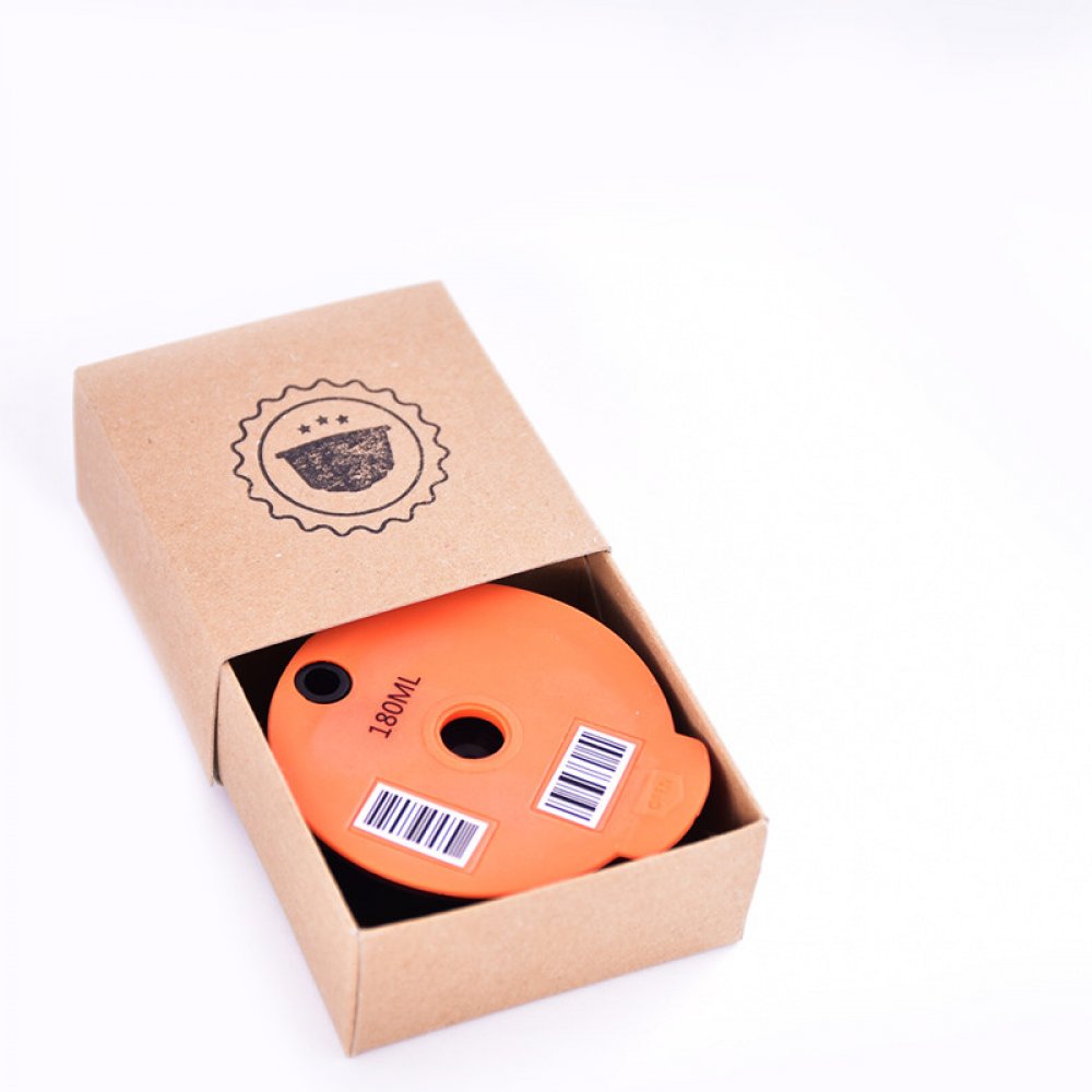 Základ kapsle tvoří pevná plastová část, která mě stejný objem při 60 ml i 180 ml verzi, rozdíl je pouze v čárovém kódu. Výška kapsle je shodná s originální kapslí na mléko, takže bude pasovat do každého stroje.