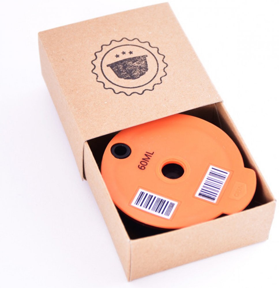 Základ kapsle tvoří pevná plastová část, která mě stejný objem při 60 ml i 180 ml verzi, rozdíl je pouze v čárovém kódu. Výška kapsle je shodná s originální kapslí na mléko, takže bude pasovat do každého stroje.