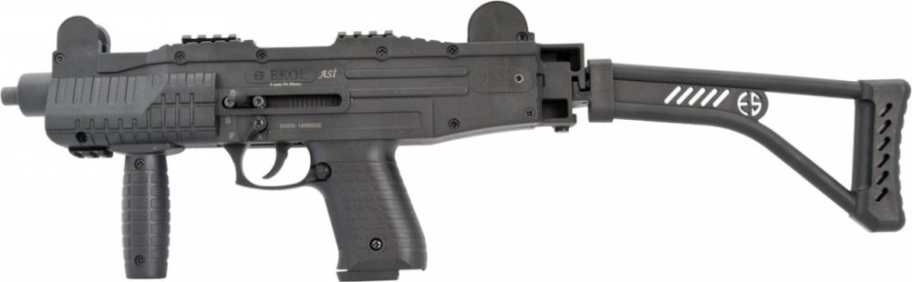 Plynová pistole Ekol ASI s pažbou cal.9mm kat. PO černáNetradiční expanzní zbraň s taktickou sklopnou pažbou od turecké firmy EKOL Voltran, která má díky své kapotáži vzhled samopalu UZI. Ekol ASI byl vyroben hlavně pro zábavnou střelbu startovacím, akustickým, poplašným střelivem. Také je často využíván jako filmová rekvizita.Co by to bylo za samopal, kdyby neměl možnost střelby dávkou. Samozřejm...