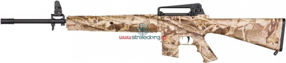 Vzduchovka Ekol M450 camo coated Standardní zlamovací vzduchovka turecké výroby Voltran Ekol, která díky polymerové kapotáži vypadá jako americká útočná puška M16. Princip zlamovacích vzduchovek: lomením hlavně dochází ke stlačení pružiny v pístu. Píst je následně zachycen spoušťovým mechanismem. Po stisku spouště je píst hnán vpřed. Tím dochází k vytvoření tlaku, který následně žene střelivo z hl...