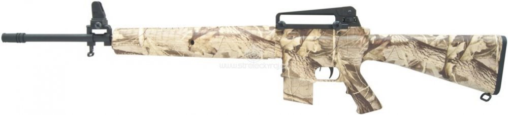 Vzduchovka Ekol M450 camo coated Standardní zlamovací vzduchovka turecké výroby Voltran Ekol, která díky polymerové kapotáži vypadá jako americká útočná puška M16. Princip zlamovacích vzduchovek: lomením hlavně dochází ke stlačení pružiny v pístu. Píst je následně zachycen spoušťovým mechanismem. Po stisku spouště je píst hnán vpřed. Tím dochází k vytvoření tlaku, který následně žene střelivo z hlavně ven. Vzduchovka Ekol M450 je osazena drážkovanou hlavní kalibru 4,5mm. Ideálním střelivem pro tento typ hlavní jsou olověné diabolky. Manuální pojistka, jištěné proti náhodnému výstřelu, se nachází před spoušť v podobě páčky ovládané vpřed a vzad. Bliže ke spoušťi je vzduchovka Ekol M zajištěná. Pro odjištěná je zapotřebí páčku posunout dále od spouště. Pro umocnění realističnosti vzduchovka nepostrádá horní madlo, za které ji lze přenášet stejně jako je tomu u ostré palné předlohy M16. V madlu najdete integrované plně stavitelné hledí. Dovoluje nastavit jak výškovou elevaci, tak stranovou korekci pomocí točítek. Muška je pak pevná. Mířidla modelu Ekol M jsou tzv. průhledová. Pro míření se snažíte najít přímku mezi kruhovým hledím, špičkou mušky a středem terče. Polymerová kapotáž v camo provedení, do které je celý systém vzduchovky Ekol M usazen připomíná útočnou pušku M16. Komu by průhledová mířidla nevyhovovala, může vzduchovku Ekol M vybavit optikou, puškohledem či kolimátorem. Pro tento účěl je zde pod madlem montážní lišta 22mm. V balení vzduchovky najdete dvojnožku na hlaveň. Použítím dvojnožky behěm střelby docílíte vyšší stability a s tím spojené přesnosti.