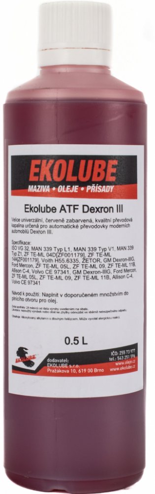 Ekolube ATF DIII je univerzální, červeně zabarvená, velmi kvalitní převodová kapalina určená pro automatické převodovky moderních automobilů všude tam, kde jsou vyžadovány kapaliny specifikace Dexron® III G. Složení, vlastnosti a použití: Ekolube ATF DIII je kapalina pro automatické převodovky na minerální bázi vyrobená z prvotřídních základových olejů a moderních aditiv určená pro osobní a náklad...