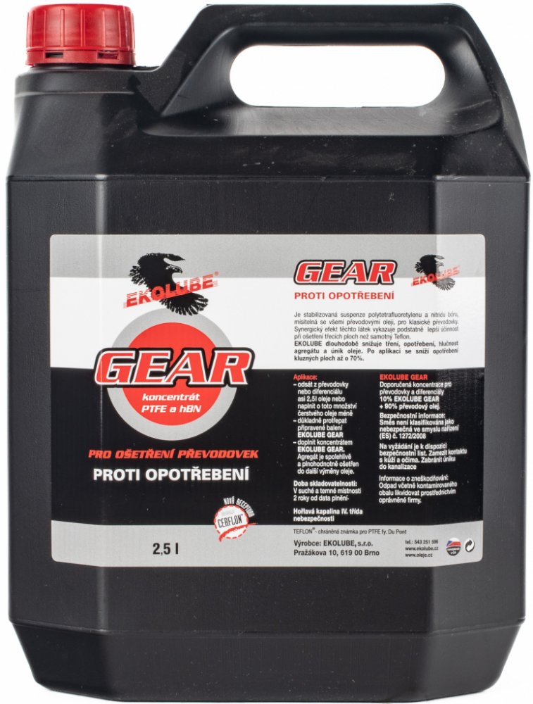 Jedná se o stabilizovanou suspenzi polatetrafluoretylenu a nitridu bóru, mísitelná se všemi převodovými oleji, pro klasické převodovky. Synergický efekt těchto látek vykazuje podstatně lepší účinnost při ošetření třecích ploch než samotný Teflon. Dlouhodobě snižuje tření, opotřebení, hlučnost agregátu a únik oleje. Po aplikaci se sníží opotřebení kluzných ploch až o 70%. Doporučená koncentrace pro převodovky a diferenciály 10% Ekolube gear+ 90% převodový olej.