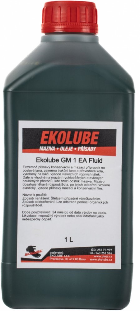 Ekolube GM 1EA Fluid je extrémně přilnavý konzervační a mazací přípravek na ocelová lana, zejména trakční lana a převodová kola, vyrobený na bázi, vysoce viskozních ropných komponentů a přilnavých min