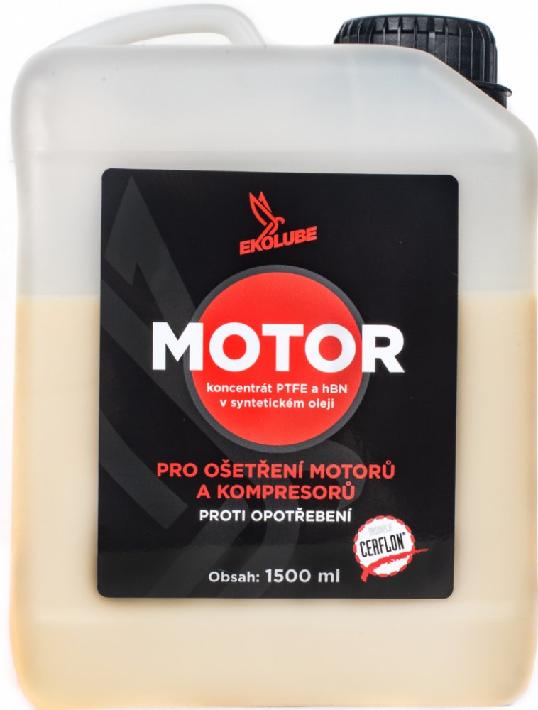 EKOLUBE Motor je koncentrát pro ošetření motorů zejména s větším počtem najetých km. Je vhodný rovněž pro ošetření kompresorů, kde jsou použity minerální a syntetické oleje mimo polyglykolů. Přípravek je určen především na snížení opotřebení, hlučnosti, vibrací a zvýšení výkonu. Doprovodným efektem je snížení spotřeby paliva a exhalací. Doporučená koncentrace do 10% objemu olejové náplně motoru nebo kompresoru.