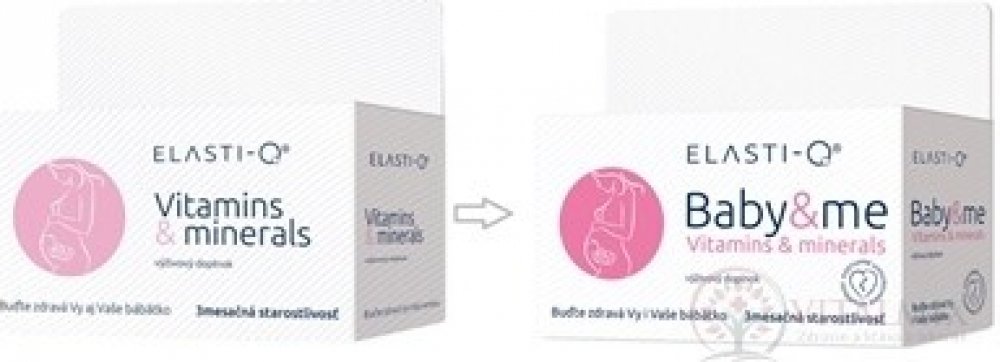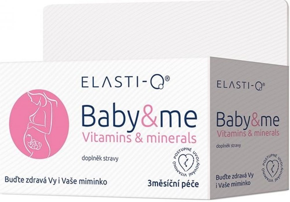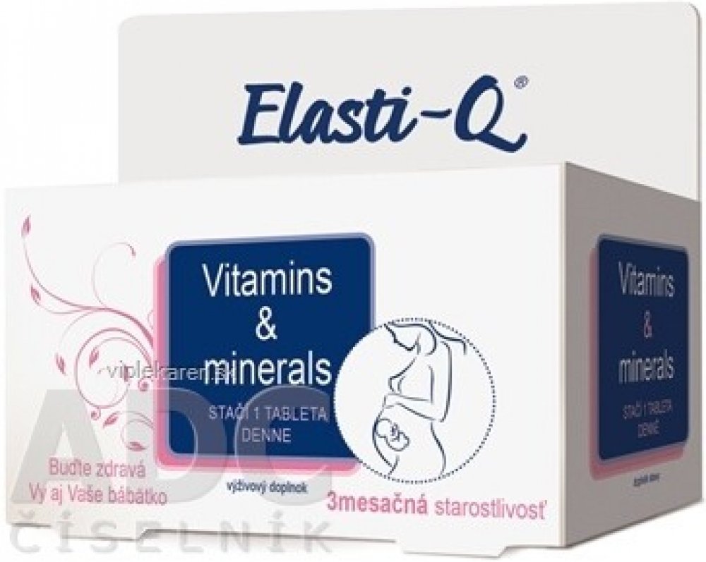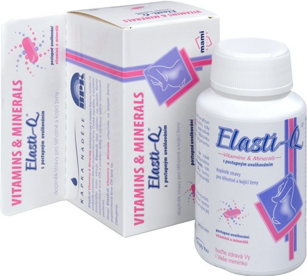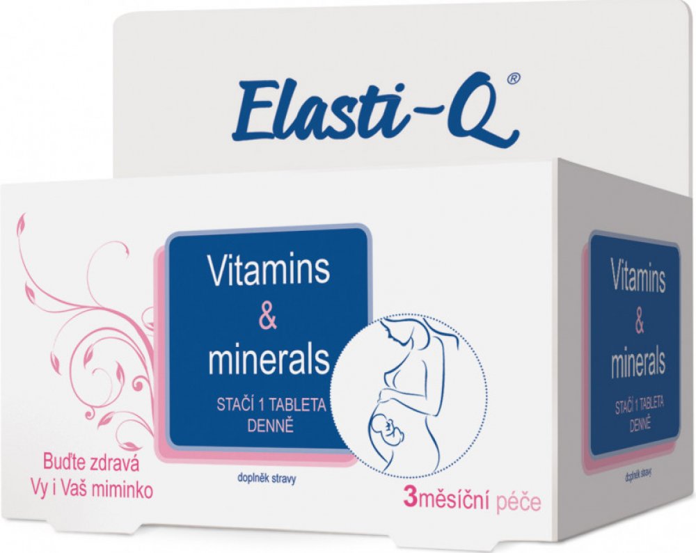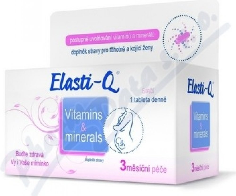 Elasti-Q Vitamins & Minerals je doplněk stravy s výjimečným a unikátním složením, který zajišťuje přísun základních vitaminů a minerálů přínosných pro období, kdy plánujete těhotenství, v jeho průběhu a i při kojení. Jednotlivé složky tohoto multiminerálního a multivitamínového přípravku jsou koncipovány s ohledem na hormonální změny v organismu ženy.Kyselina listová napomáhá procesu dělení a diferenciaci buněk a k normální krvetvorbě a růstu zárodečných tkání během těhotenství.Vitaminy B6 a B12 snižují míru únavy a vyčerpaní, přispívají k tvorbě červených krvinek, navíc také pomáhají posilovat funkci imunitního systému.Vitamin C pomáhá k vstřebávání železa a zároveň také posiluje imunitní systém. Vitamin D přispívá k vstřebávání vápníku, čímž také napomáhá k normálnímu stavu zubů a kostí. Zinek přispívá k syntéze DNA a zároveň má blahodárný účinek na nehty, vlasy a vzhled kůže. Železo se podílí na procesu dělení buněk a přispívá k tvorbě hemoglobinu. Doporučené dávkování: 1x denně 1 tableta během jídla