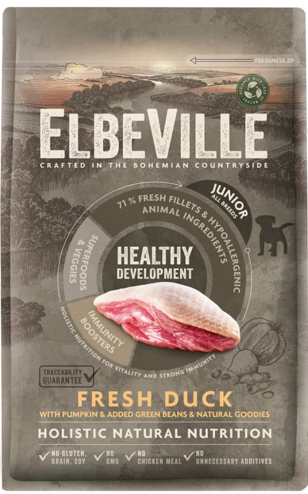 ELBEVILLE je přirozená strava pro celkové zdraví Vašeho psa. Je vyrobená z nejlepších přírodních, lokálních surovin včetně tzv. superpotravin a s vysokým obsahem kvalitního čerstvého masa. Tato receptura obsahuje 35 % čerstvých vykostěných filetů z kachny a dále 28 % dehydrovaného kachního a krůtího.