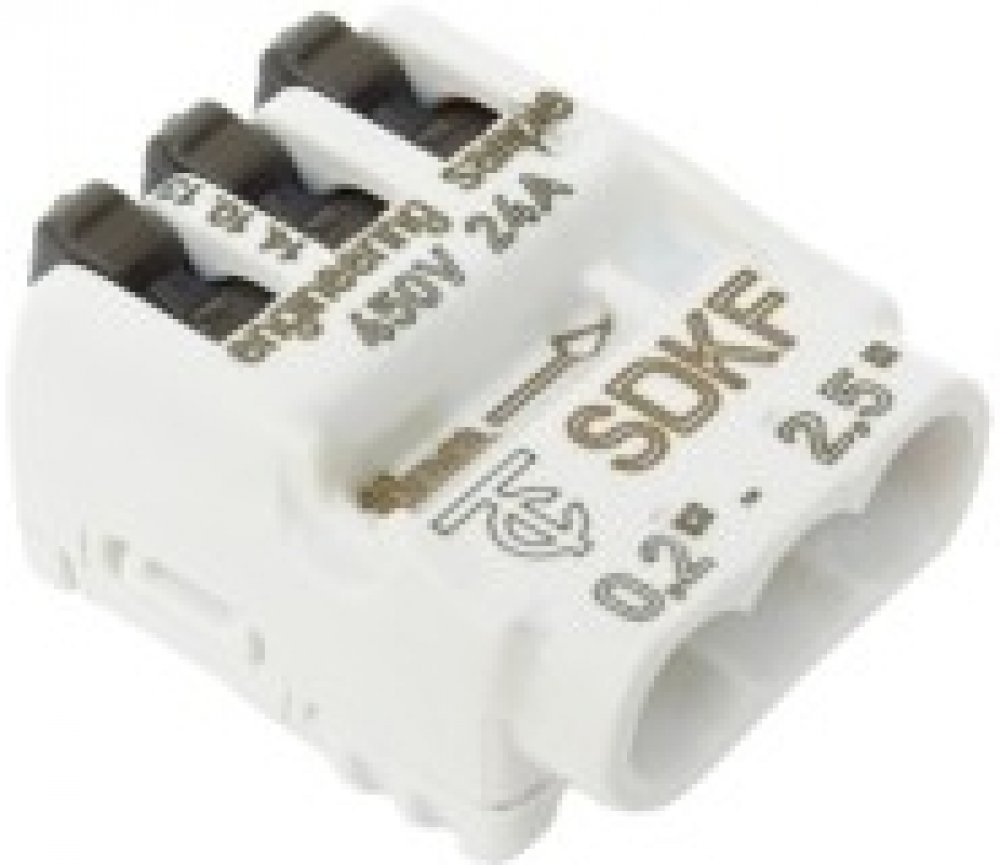 Svorka krabicová páčková SDKF 3 - univerzální (pevný i laněný vodič), bezšroubová, 3x0,2-2,5mm2, bílá.Bezšroubové svorky. V bezšroubové svorce lze propojit vodiče různých průřezů a to buďto s pevným jádrem (typy SDK, P 01, PC) a nebo kombinovat i laněné (typy SDKF, SLC). U pevných vodičů není nutné použití uvolňovací páčky. U laněných vodičů použít uvolňovací páčky. Svorky šetří prostor i čas při instalacích, navíc jsou opatřeny otvorem pro měření. Vyrábí se od 2 vstupních otvorů až po celkový počet 12 míst. Max. zatížitelnost je 32 A jmenovité napětí až 450 V.• SDK - pevný vodič 0,5 - 2,5 mm2• P 01 - pevný vodič 0,5 - 2,5 mm2• PC - pevný vodič 0,2 - 2,5 mm2 (u svorky PC2112 od 0,5 do 2,5mm2)• SDKF - pevný i laněný vodič 0,2 - 2,5 mm2• SLC - pevný i laněný vodič 0,2 - 4 mm2