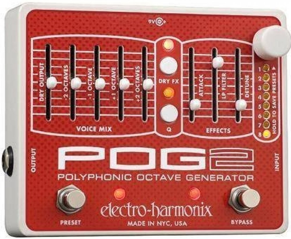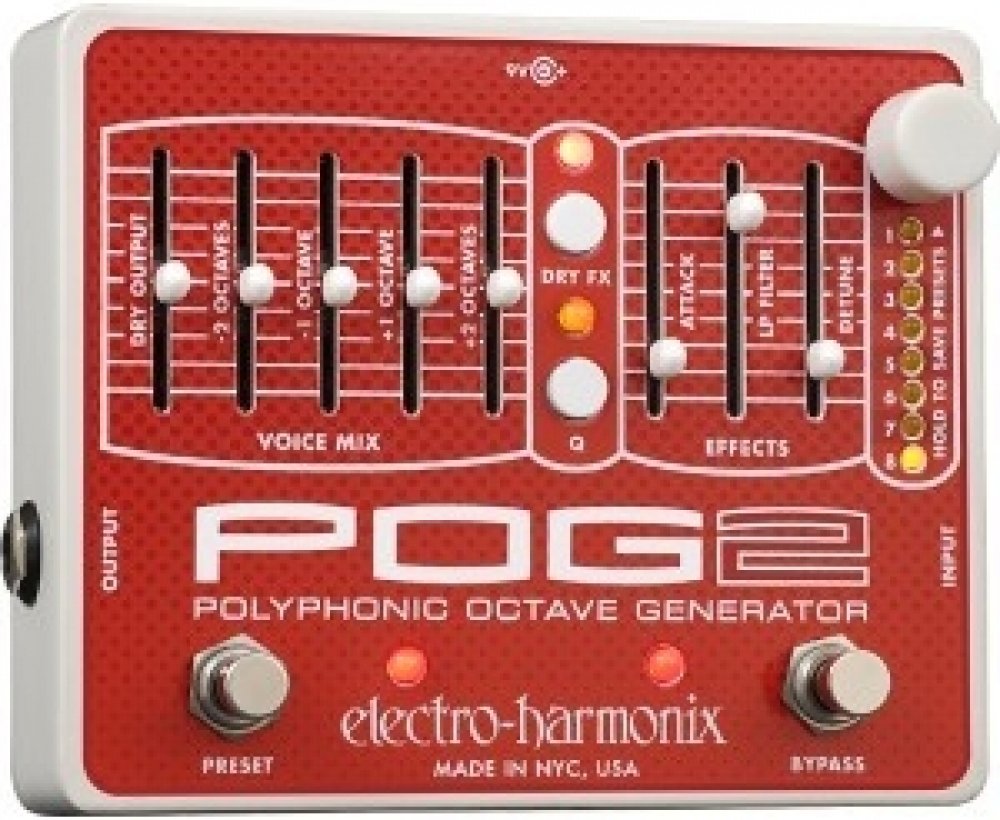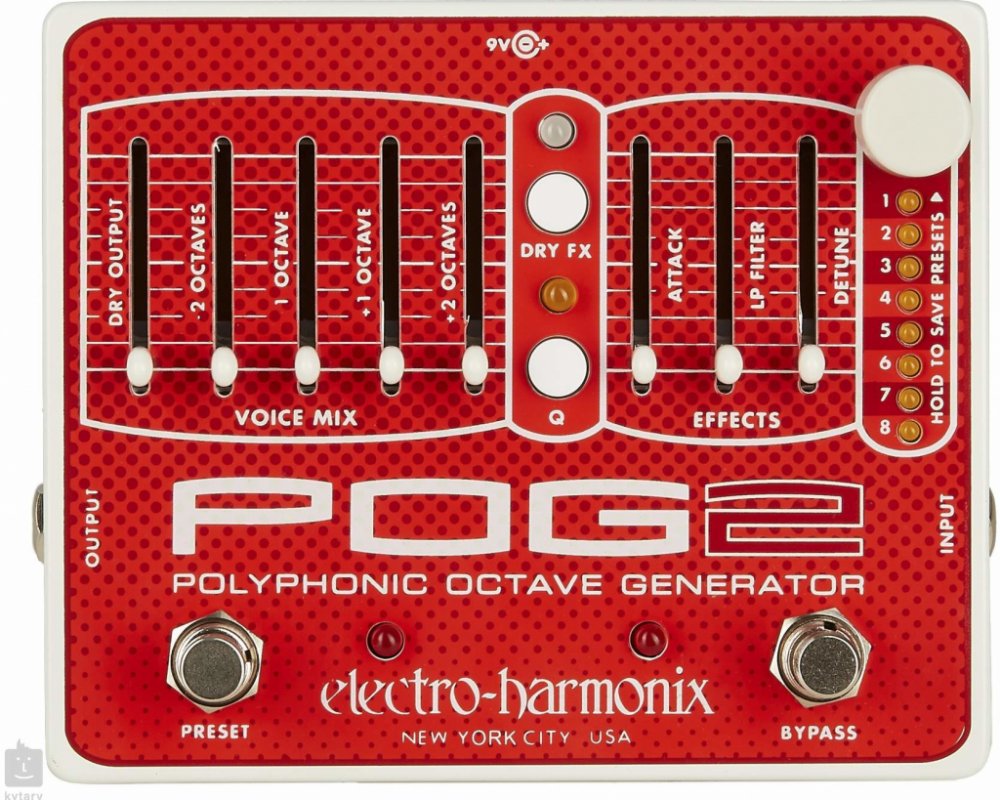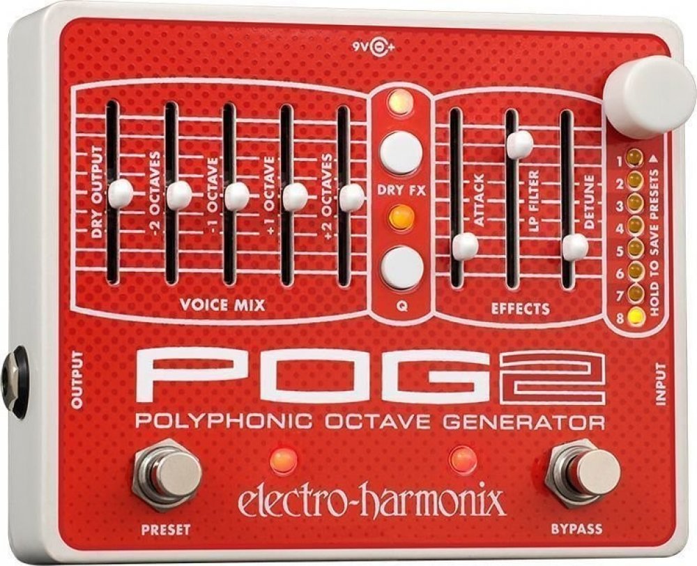 EHX POG 2 je polyfonní oktavér, který vám umožní harmonizovat hrané noty/akordy/akordové rozklady ve čtyřech oktávách (dvě oktávy nahoru, dvě oktávy dolů). Jednoduše stačí v levé části pedálu nastavit hlasitost přidaných oktáv a průchozího čistého signálu. Aby toho nebylo příliš málo, tak v pravé části můžete pomocí tří faderů určit rychlost náběhu oktávového efektu (Attack), kdy lze nastavením vytvářet swell/reverse efekty, množství propouštěných/ořezu basových frekvencí (LP Filter) a míru jemného rozladění oktávového efektu (Detune) v rozsahu 1 až 2 centy. Tlačítkem DRY FX určíte způsob routingu čistého signálu, kdy může úplně obejít/bypassovat efektovou sekci, projít přes Attack, Attack/LP Filter nebo všechny tři sekce Attack/LP Filter/Detune.Pomocí tlačítka či footswitche Preset lze vybírat, volit a ukládat v osmi presetech, které POG 2 nabízí. Veškerá elektronika pedálu je zasazena v odolném kovovém šasi. Krabička pracuje v režimu true bypass, takže ve vypnutém stavu nijak neovlivňuje průchozí signál. K napájení slouží přibalený adaptér.