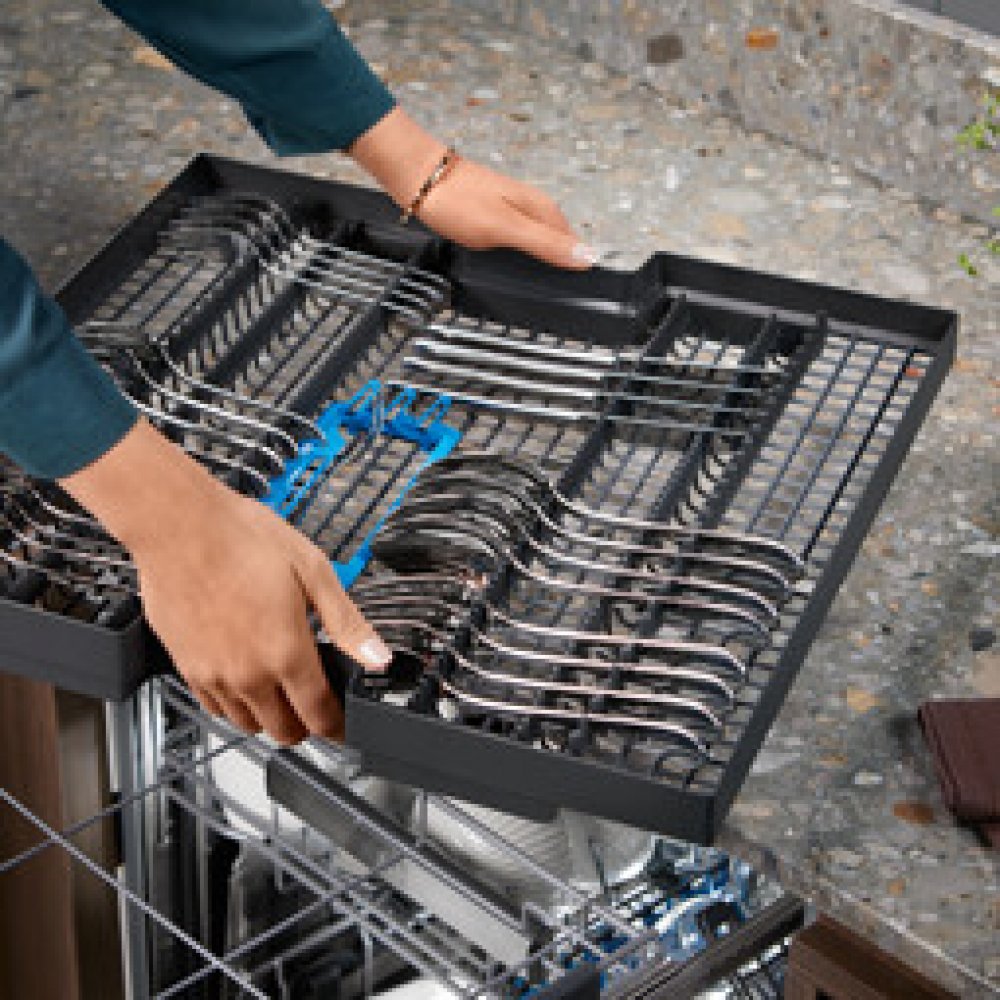 Náše prostorná, vyjímatelná příborová zásuvka maximálně usnadňuje plnění, mytí a vyjímání náčiní. Je vybavena i prodlouženým oddílem pro mytí dlouhých a objemných kusů. Je to ideální způsob mytí.