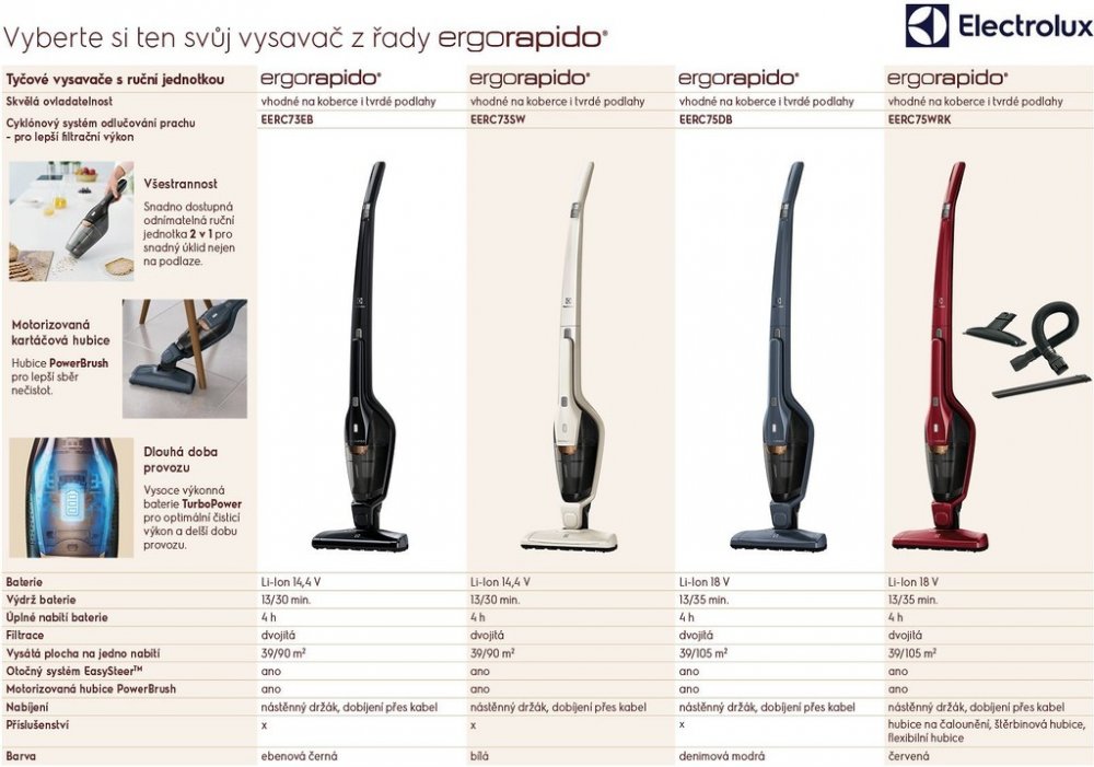 Electrolux tyčové 0.5 l modré bezsáčkové suché akumulátorové EPA 2 v 1 denní rychlý úklid 79 dB 2.46 kg 18 W běžný byt (2-3 pokoje) velmi snadné (<2.5kg) nevhodný (>78dB) zachytí většinu alergenů drobky a lehké nečistoty speciální pro zvířata (turbo + hubice) nástěnný držák s nabíjením Li-Ion 35 min 4 hod 5 1500 mAh nízká (bezsáčkový nebo omyvatelné) standardní vyprázdnění nádoby velmi nízké (bezsáčkový) standardní rozšířené: 3-4 nástavce standardní ovládání