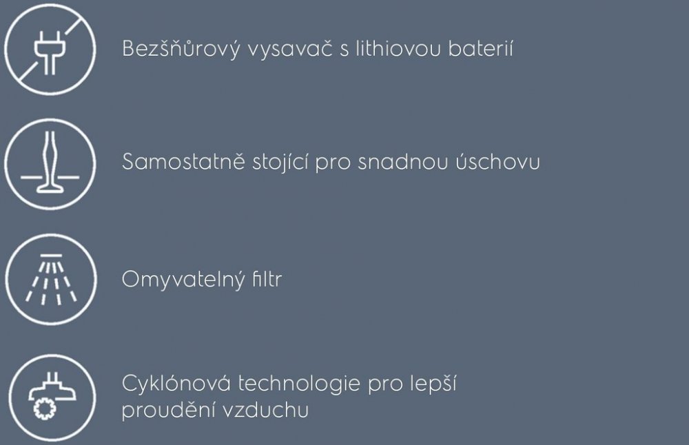 Bezdrátový akumulátorový vysavač: Vysavač má dobíjecí baterii. Je tedy přenosný a vhodný pro rychlé a snadné použití.