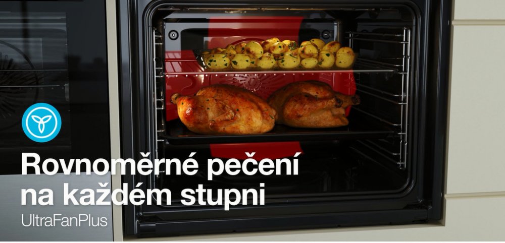 Díky systému ohřevu UltraFanPlus, který se vyznačuje extra velkým ventilátorem a speciálním vedením vzduchu, se budou vaše jídla připravovat rovnoměrně, kamkoliv je v troubě umístíte.