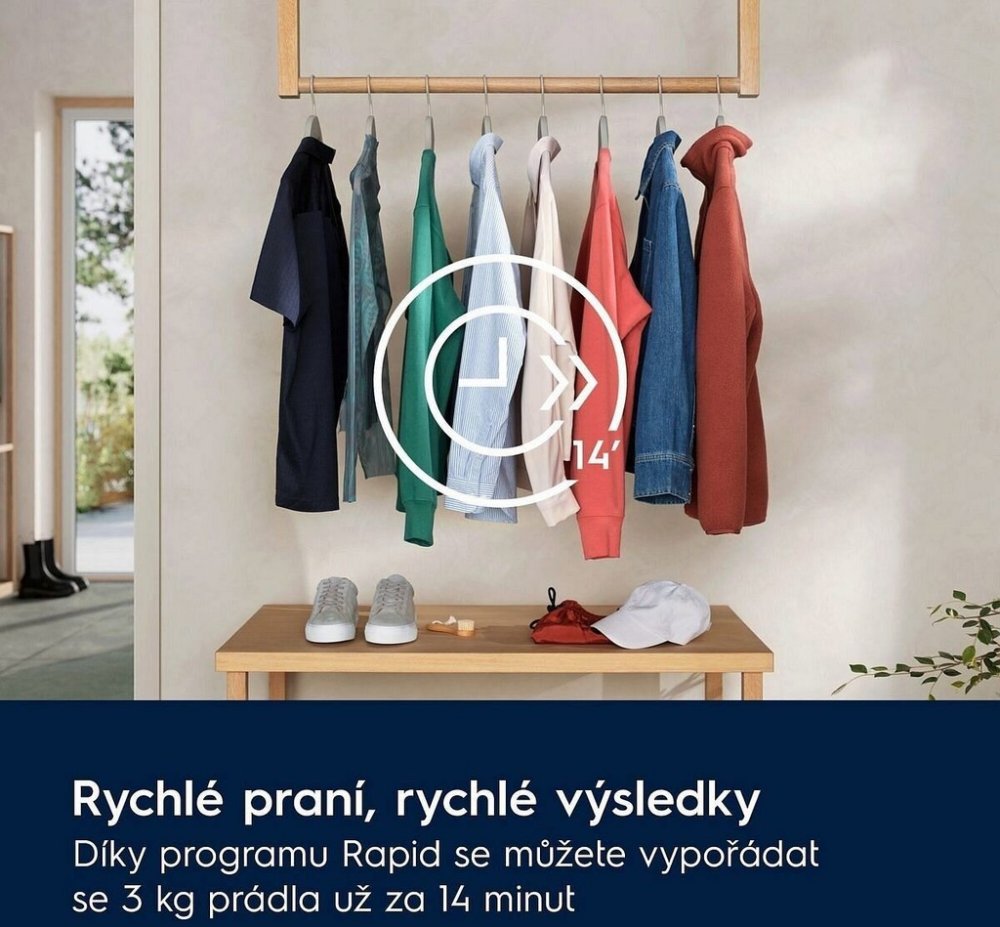 Prací programy: bavlna , syntetika, jemné prádlo, vlna , rychlý 14 minut, máchání , odstřeď./vypouštění, džíny , sport, hedvábí , přikrývka, outdoor, Hygiena, Eco 40-60