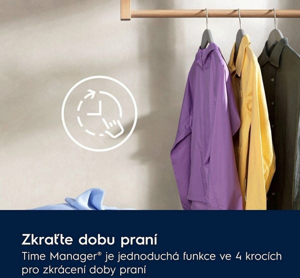 Funkce: zap./vyp., TEMP SELECTION, výběr otáček, předpírka, STAIN, pouze máchání, tichý, snadné žehlení, DELAY, TIME MANAGER, start/pauza