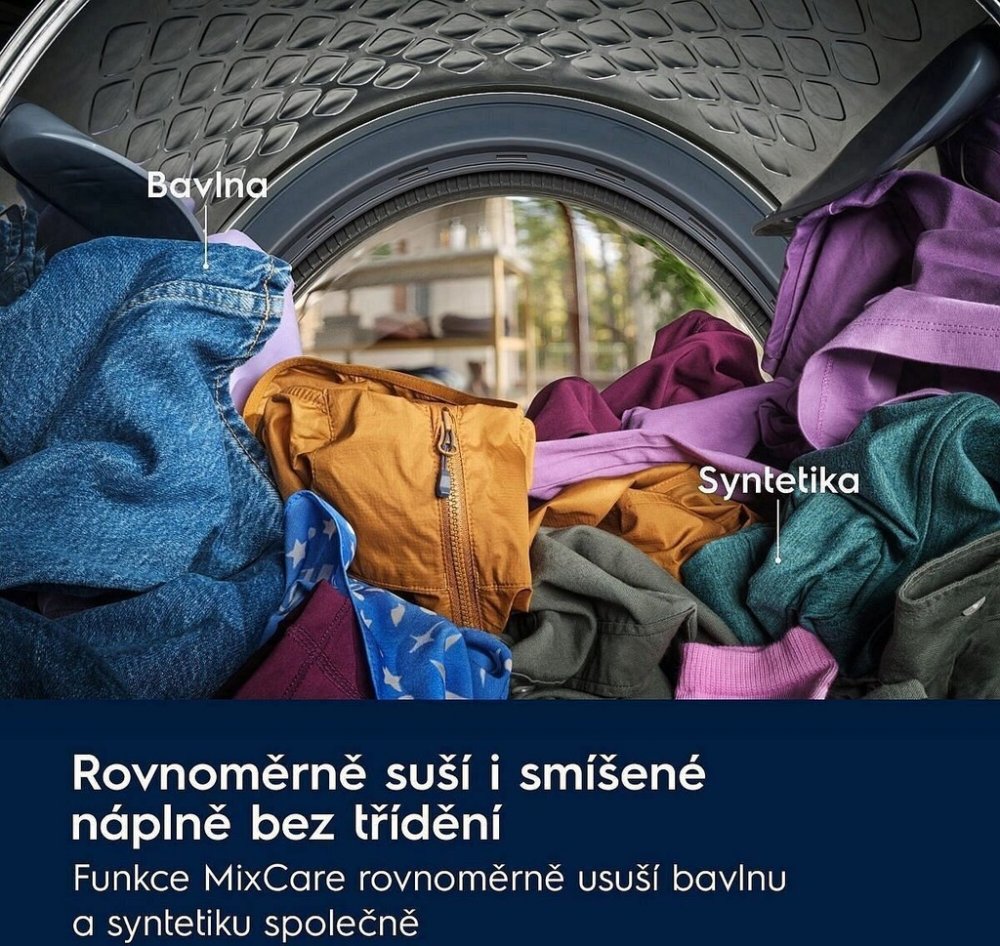 MixCare přináší výkonné, ale šetrné sušení smíšených bavlněných i syntetických materiálů a zaručuje rovnoměrné sušení oblečení bez nutnosti třídění.