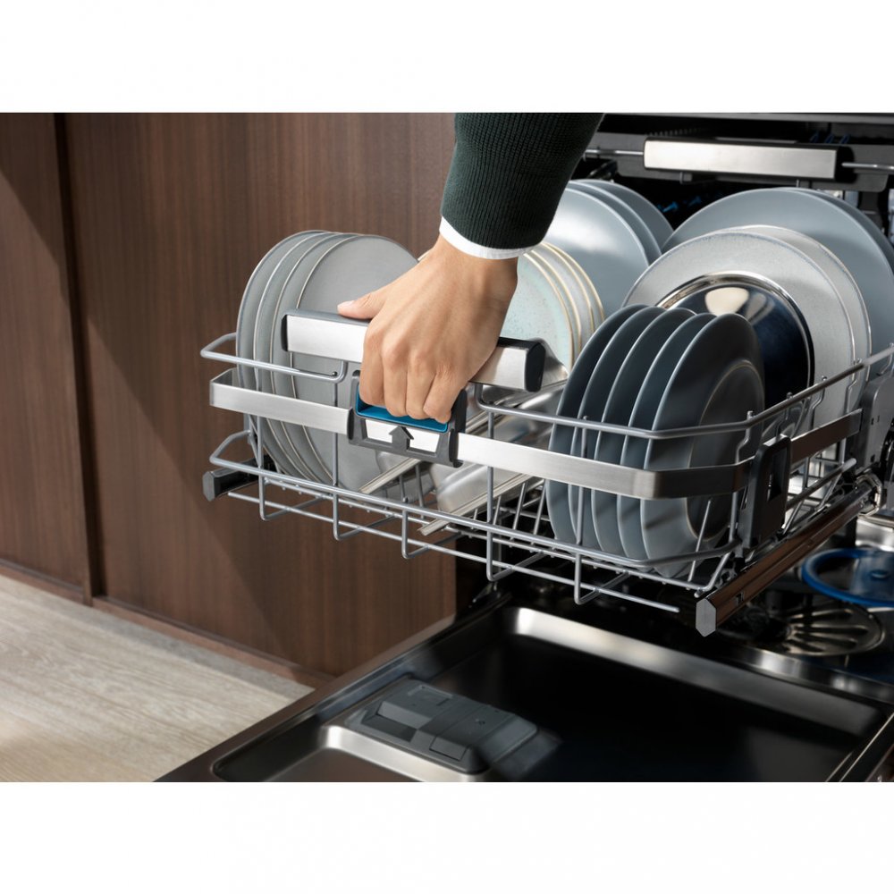 - Dolní košík má 4 rozložitelné talířové poličky ComfortLift®, Nerezové držadlo