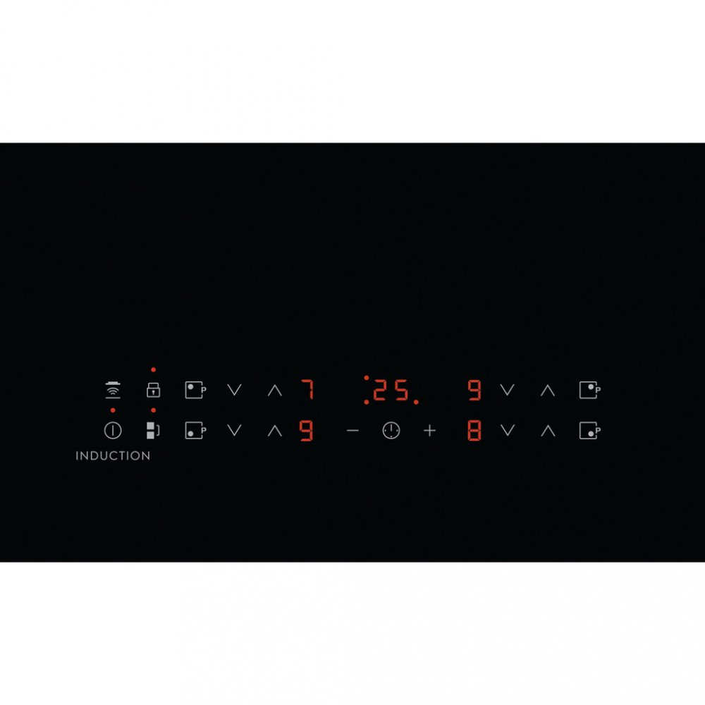 Kontrolní funkce: 3 krokové využití zbytkového tepla, akustický signál, automatické zahřátí, funkce POWER (Booster) = rychlé ohřátí, dětský zámek, propojen s odsavačem Hob2Hood, Zajištění/odjištění ovládacího panelu, Levý Bridge, minutka, ukazatel času