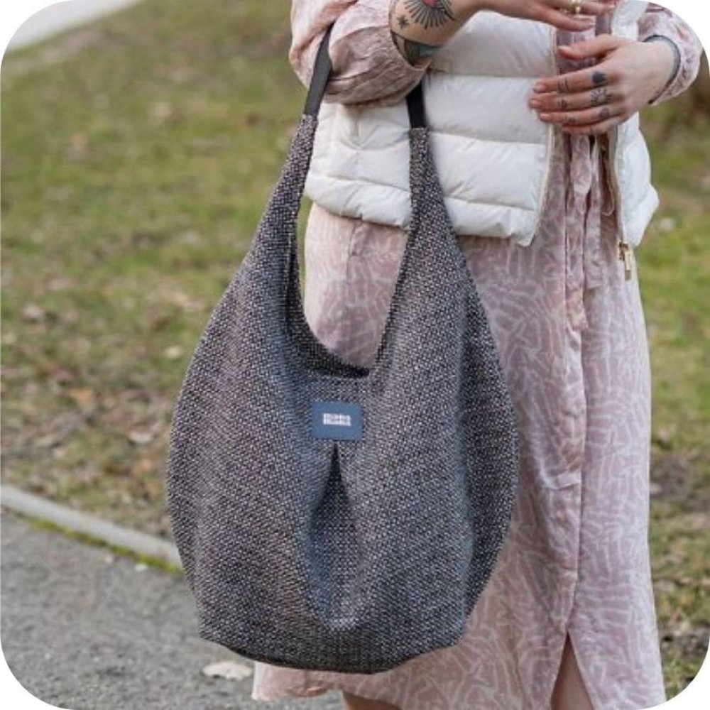 Elegantní taška z hrubé tkaniny. Uvnitř je silná bavlněná podšívka, a tři kapsy - dvě otevřené a jedna se uzavírá pomocí zipového uzávěru. Taška má pevný popruh - z eko kůže. Tvar kabelky v kapkovém designu. Je možné ji nosit volně přes rameno nebo v ruce.