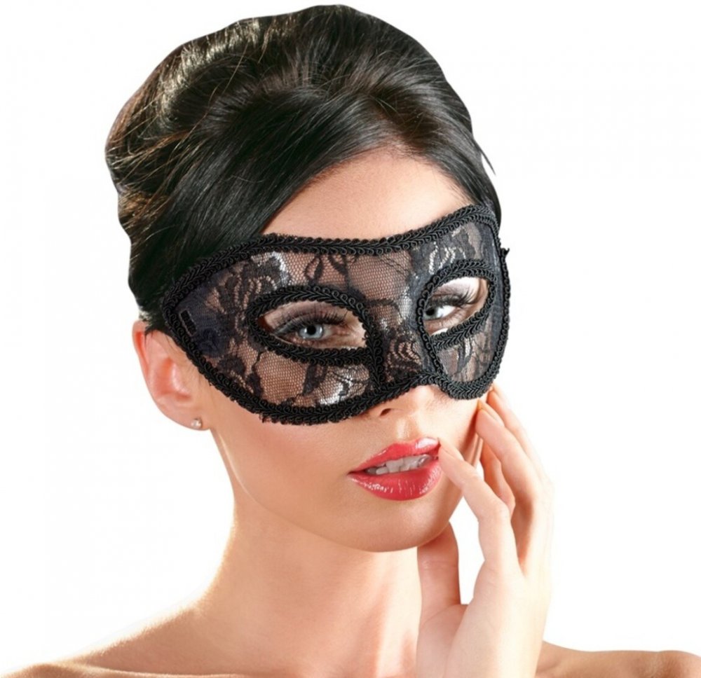 Krásná černá maska ​​vytvořená jemnou, propracovanou výšivkou. S otvory pro oči. Krajkovou stuhu lze zavázat vzadu na hlavě.