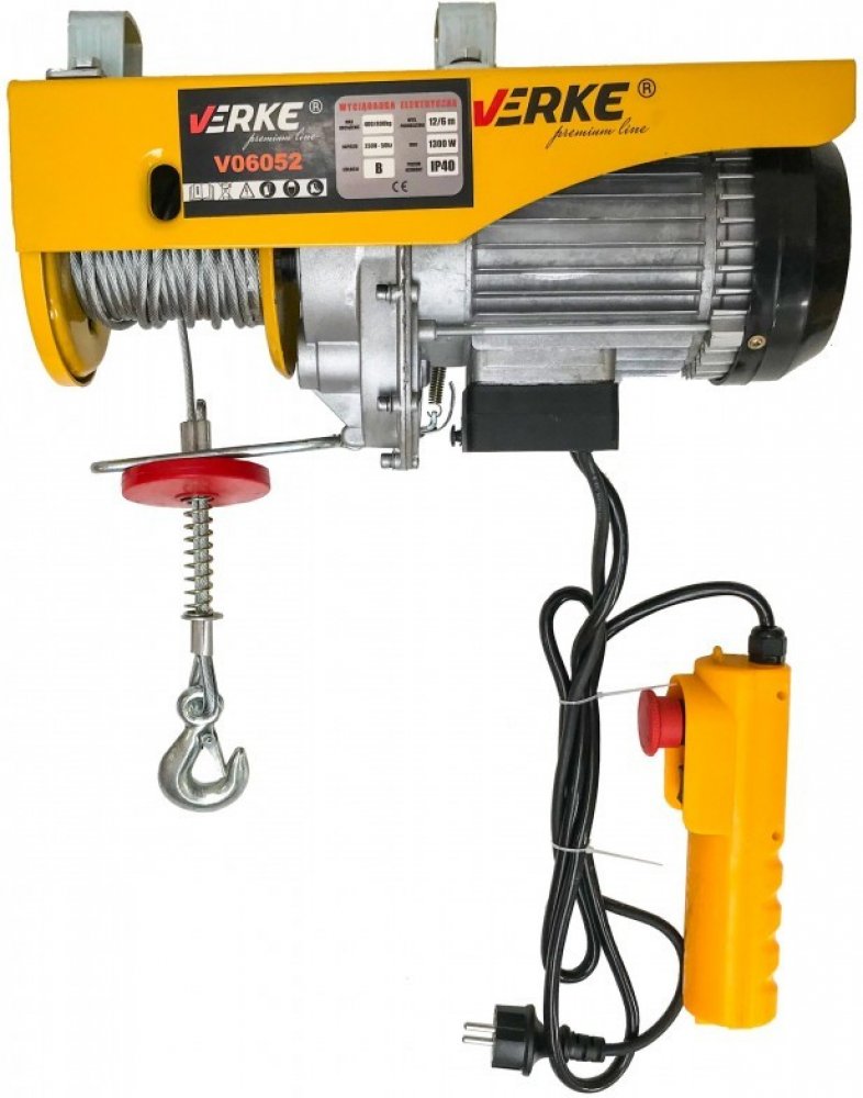 Profesionální lanový naviják Verke Premium Line. Elektrický naviják je zařízení určené pro přepravu nákladů ve vertikální rovině. Běžně se využívá při stavbě a rekonstrukci domů a také v mechanických dílnách. Pohon zajišťuje elektrický motor napájený z sítě 230 V. Pracovním prvkem je silné lano vyrobené z ocelového drátu. Zařízení má ovládací konzoli umístěnou na dlouhém elektrickém kabelu a automatický vypínač navíjení. Silný motor umožňuje rychlé zvedání předmětů bez nadměrné námahy obsluhy. Pevný hák snadno připevníte k nákladu a je vybaven bezpečnostní západkou. Je nezbytný při zvedání těžkých břemen do velkých výšek s maximální bezpečností.