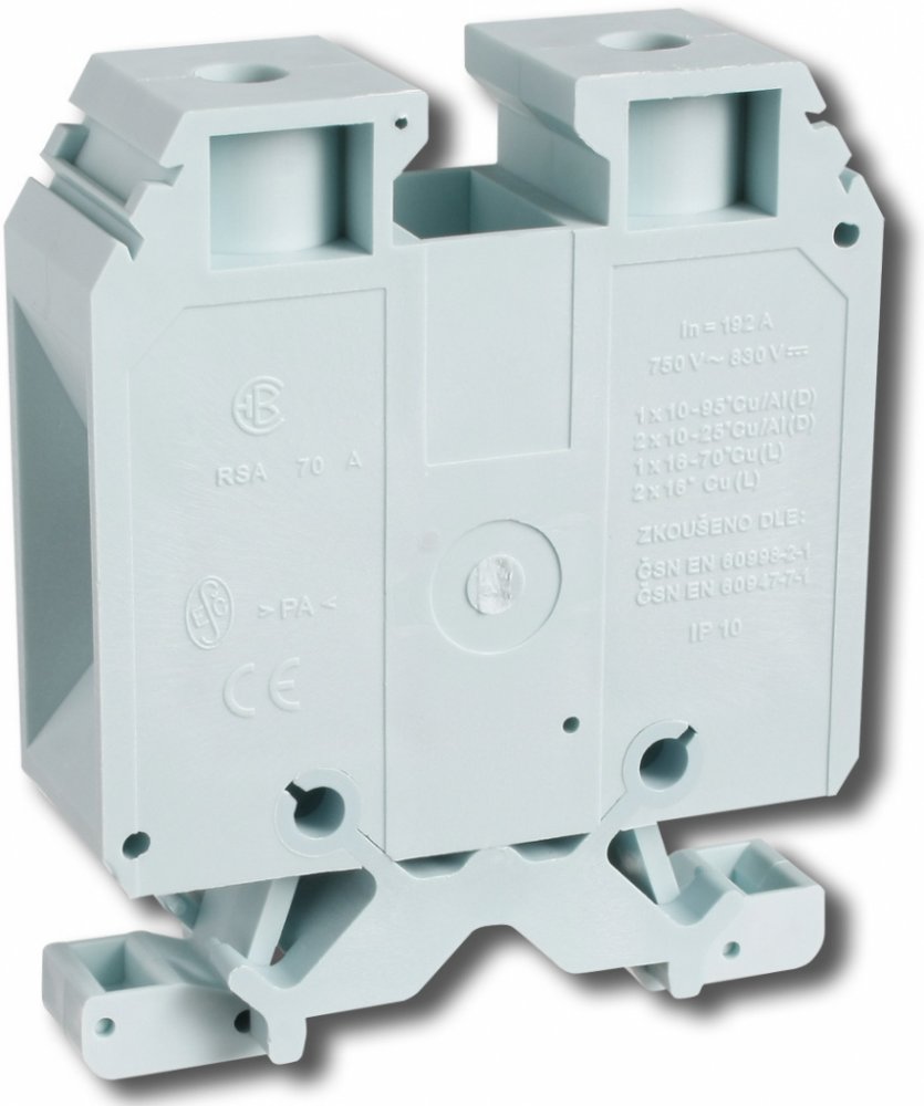 Technické parametry: Jmenovitý proud: 192 A Jmenovité napětí: 1000 V Rozměry: 24 x 85 x 70 mm Rozsah upínaných vodičů: Cu (D-plný tuhý vodič): 10-16 mm2 Cu (L-slaněný vodič): 25-95 mm2 Maximální počet vodičů x průřez vodičů: Cu (D-plný tuhý vodič): 2 x 10-16 mm2 Cu (L-slaněný vodič): 70 mm2 Zkratová odolnost: 8400 A Barva: světle modrá