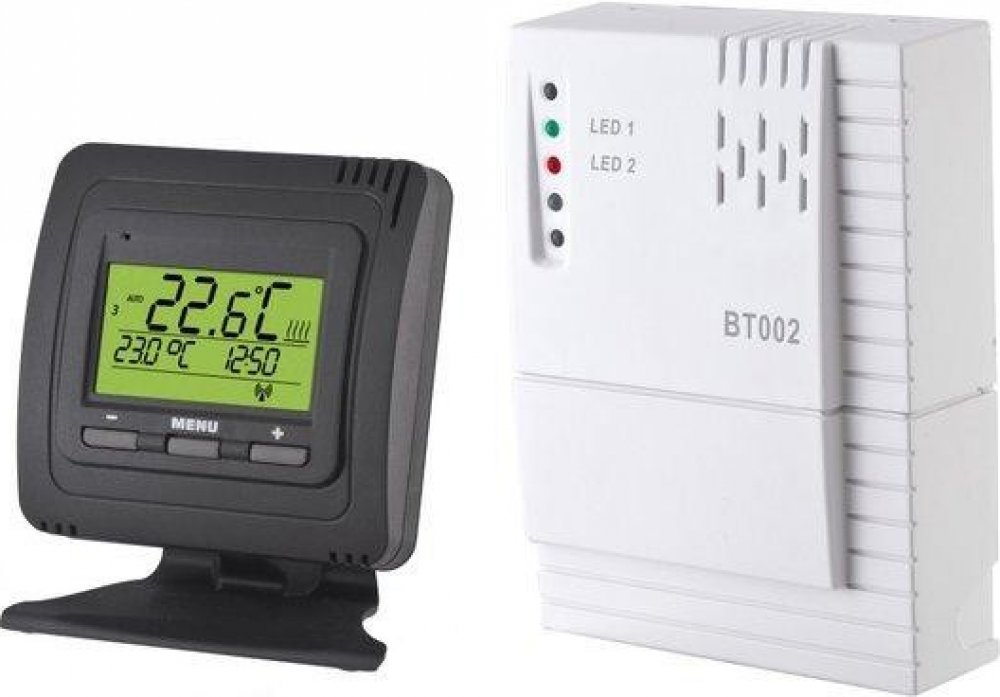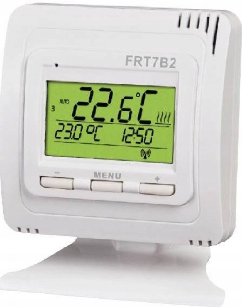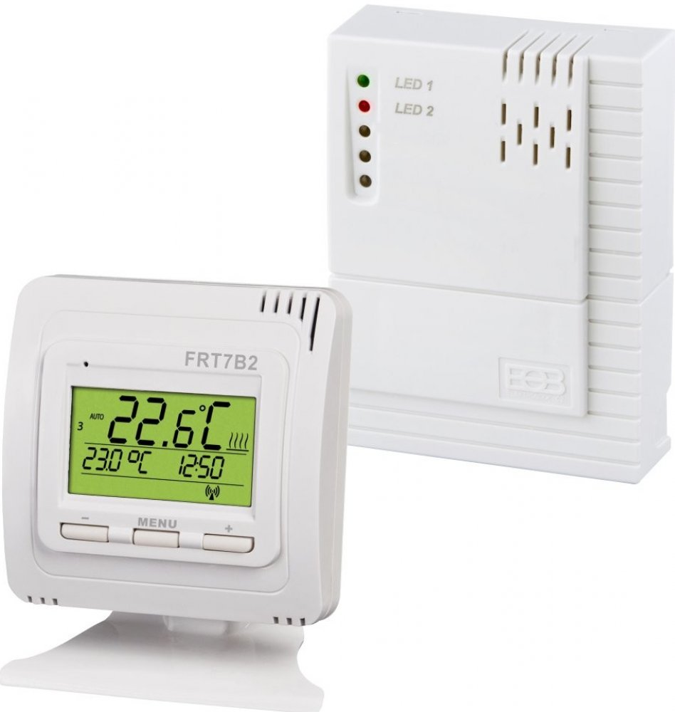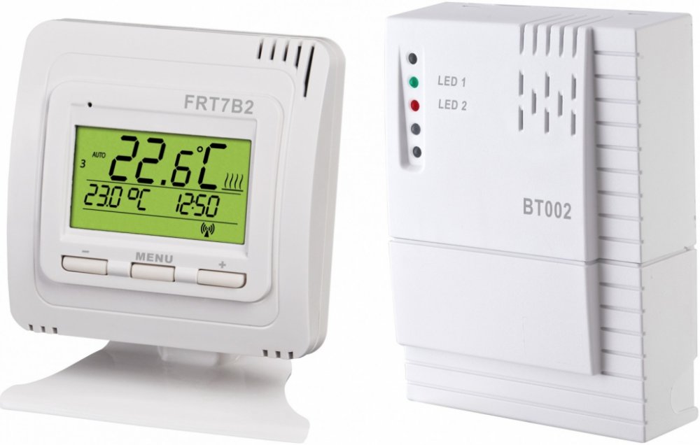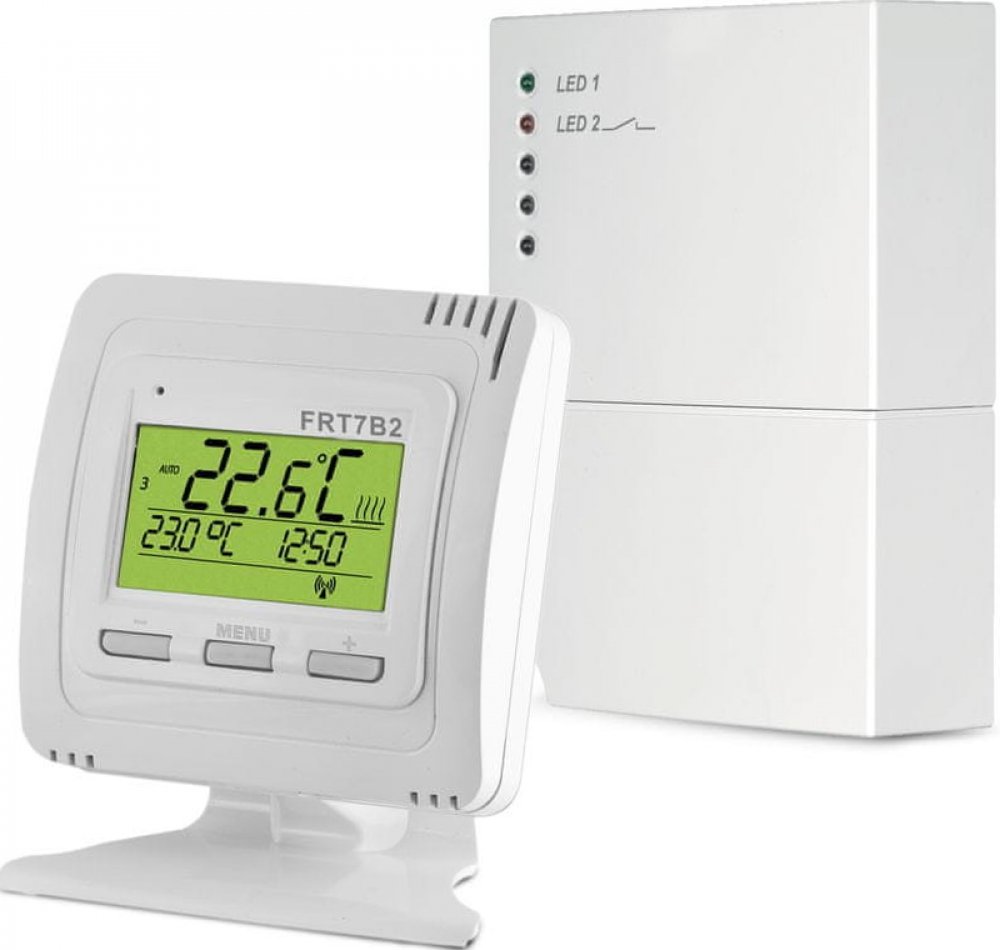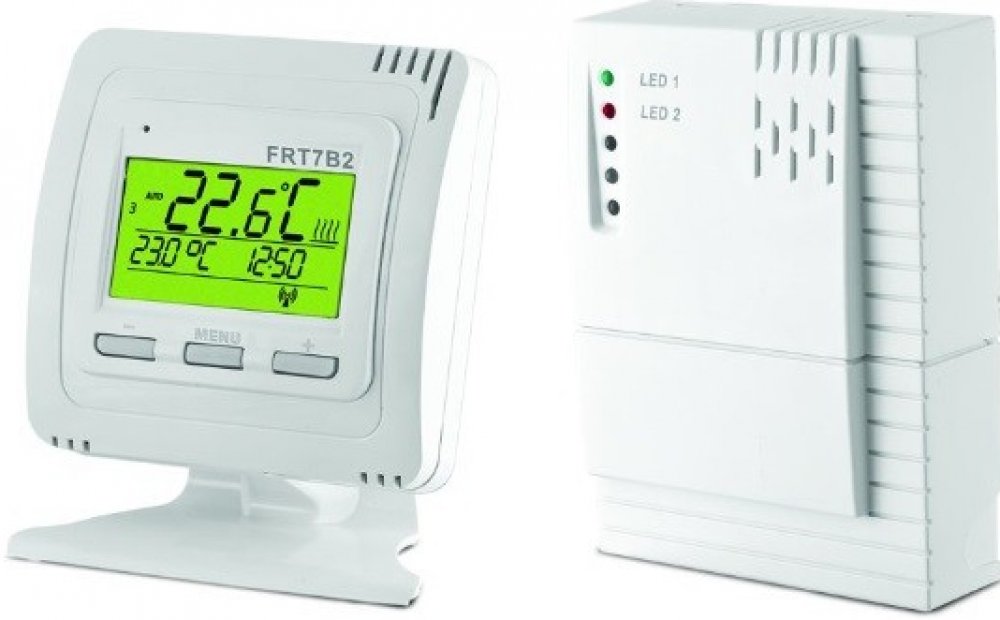 Set bezdrátového termostatu - vysílače (monitoruje teplotu v konkrétní místnosti) a spínacího prvku - příjimače (obsluhuje připojený tepelný zdroj podle požadavků na teplotu).Vlastnosti bezdrátového termostatu FRT7B2: