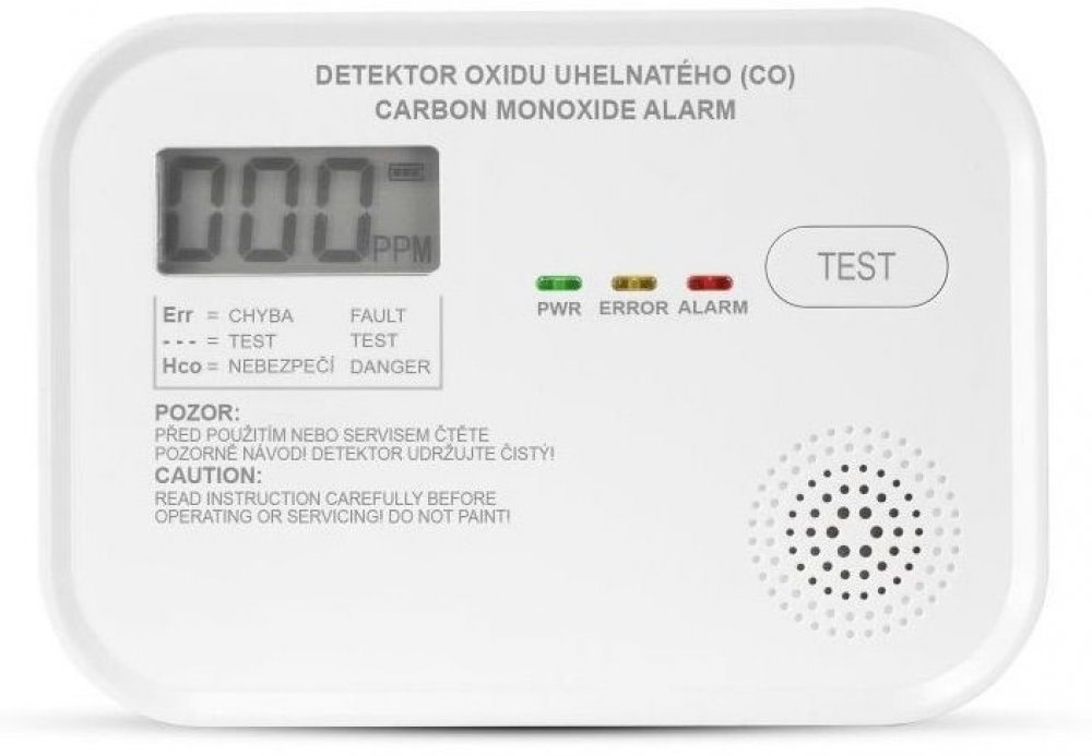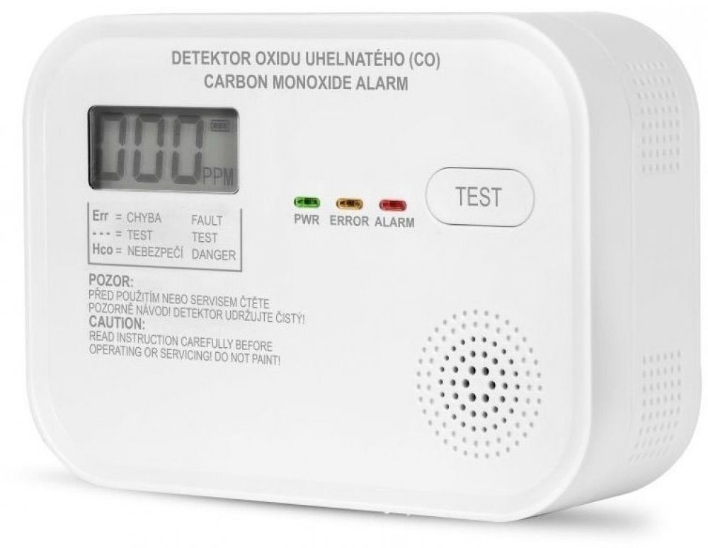 Bateriový detektor oxidu uhelnatého s českým popisem a displejem pro vizuální signalizaci zvýšené koncentrace CO.
