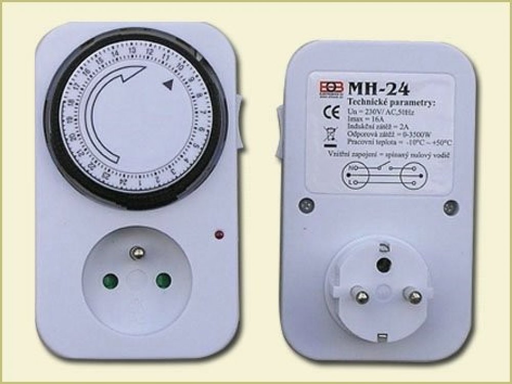 Mechanická spínací zásuvka s 24 hodinovým cyklem. Minimální nastavitelný časový úsek je 15 minut.