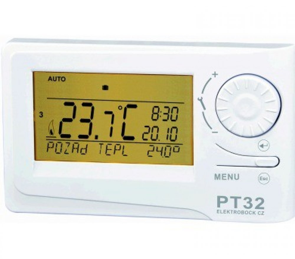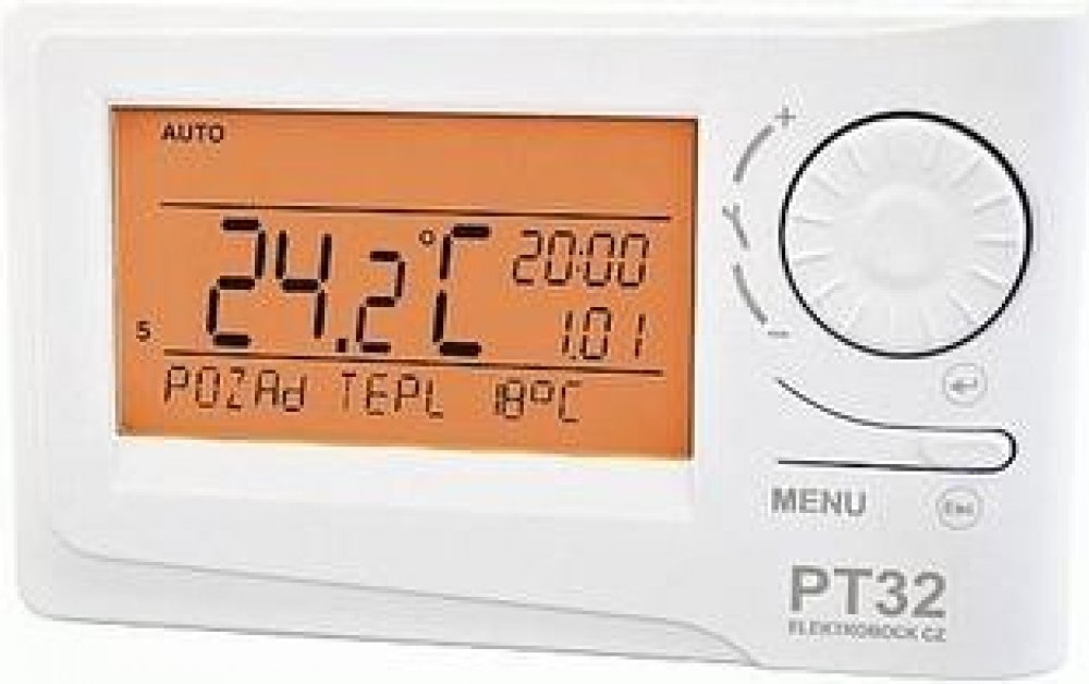 Prostorový termostat PT32 s podsvíceným velkým displejem a inteligentní regulací.