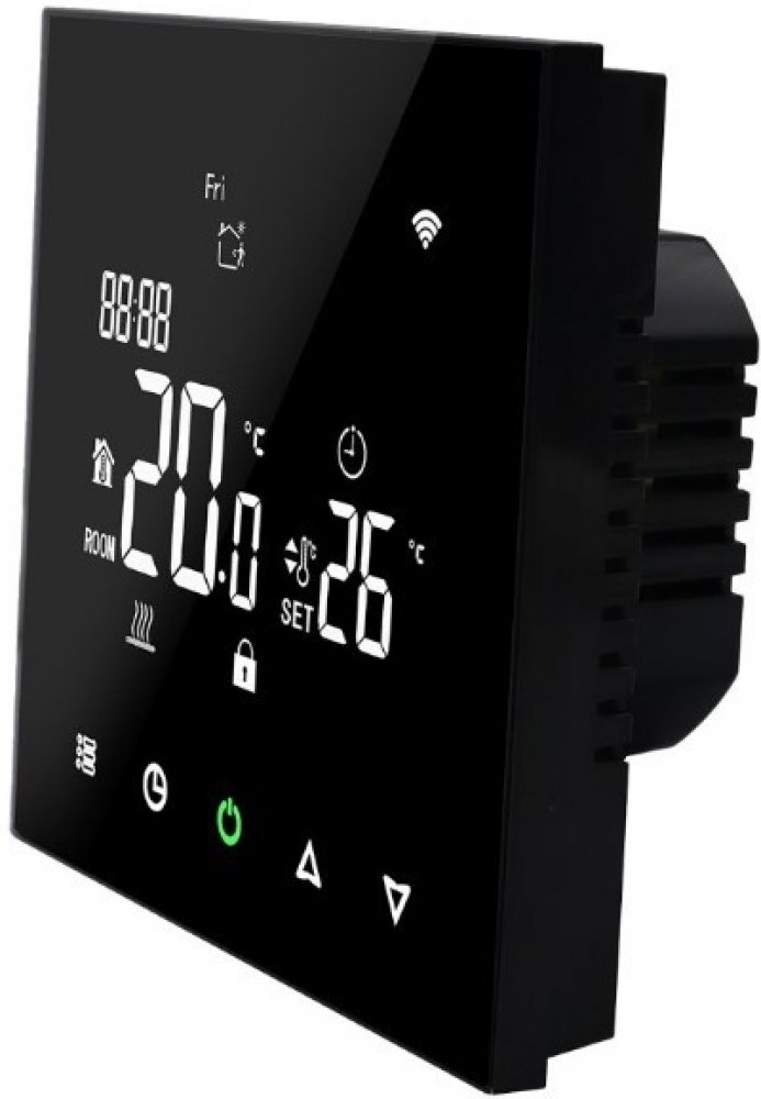 Jednoduchý programovatelný termostat s podsvíceným displejem Elektrobock PT740W-EI Wi-Fi pro elektrické topení jako jsou infrapanel, přímotop nebo podlahové topení. Termostat vyniká jednoduchým ovládáním, příhodnou cenou a ovládáním přes wi-fi pomocí aplikace v chytrém telefonu. Termostat reguluje teplotu topení prostorovým čidlem.