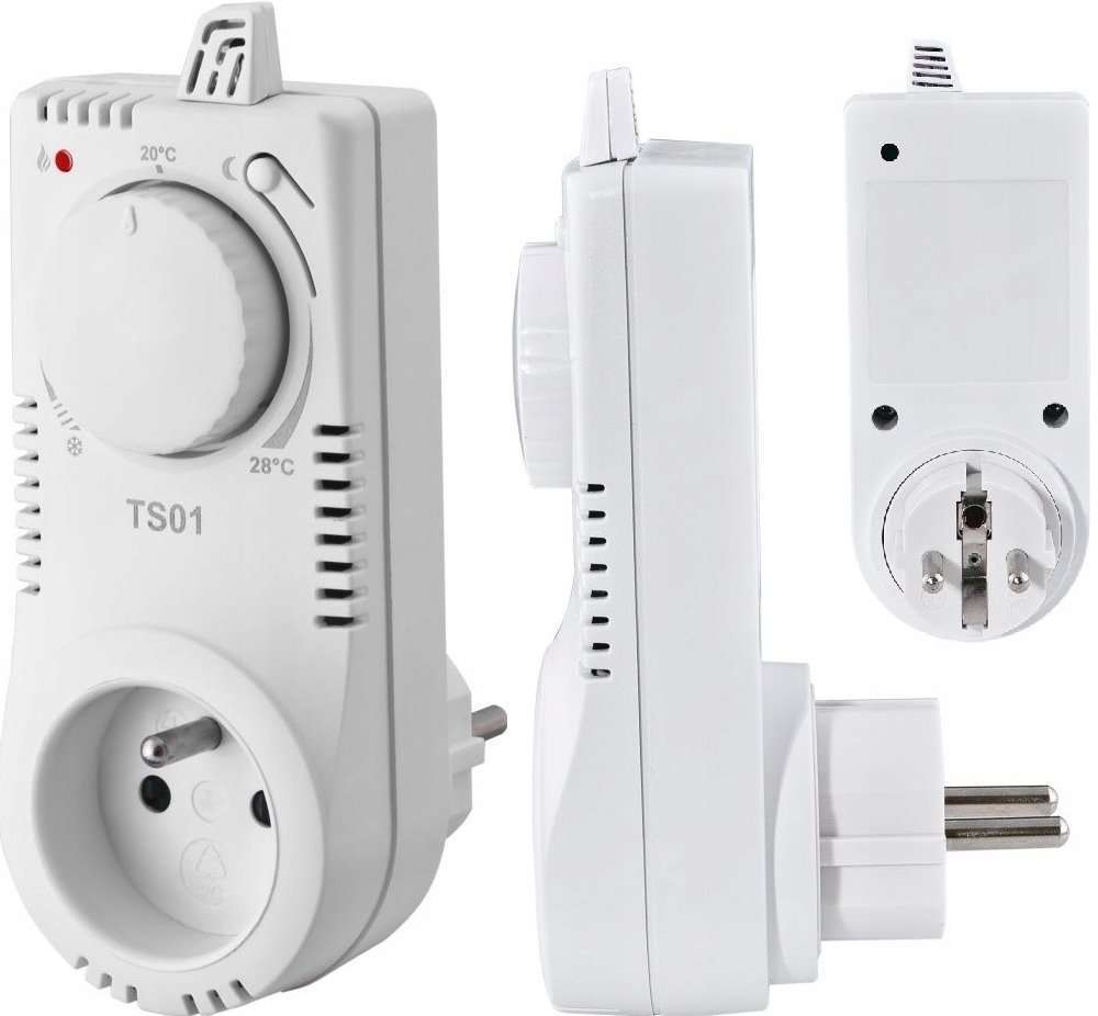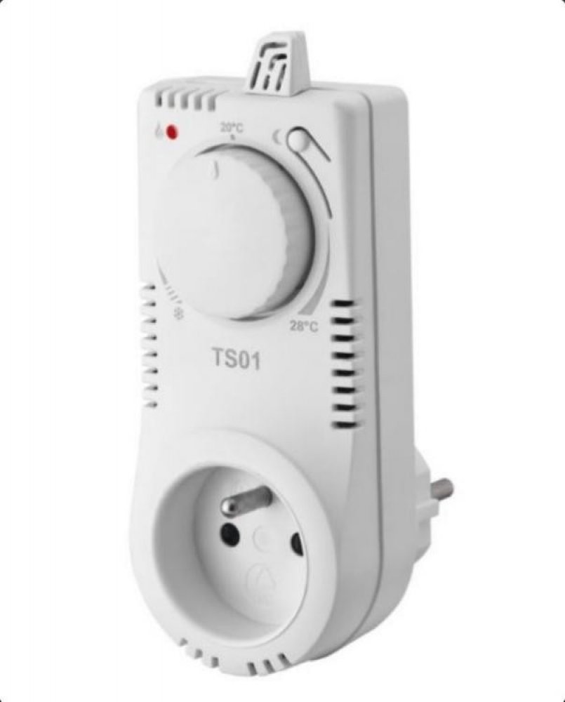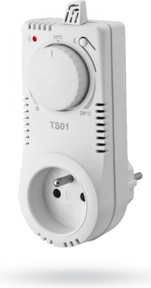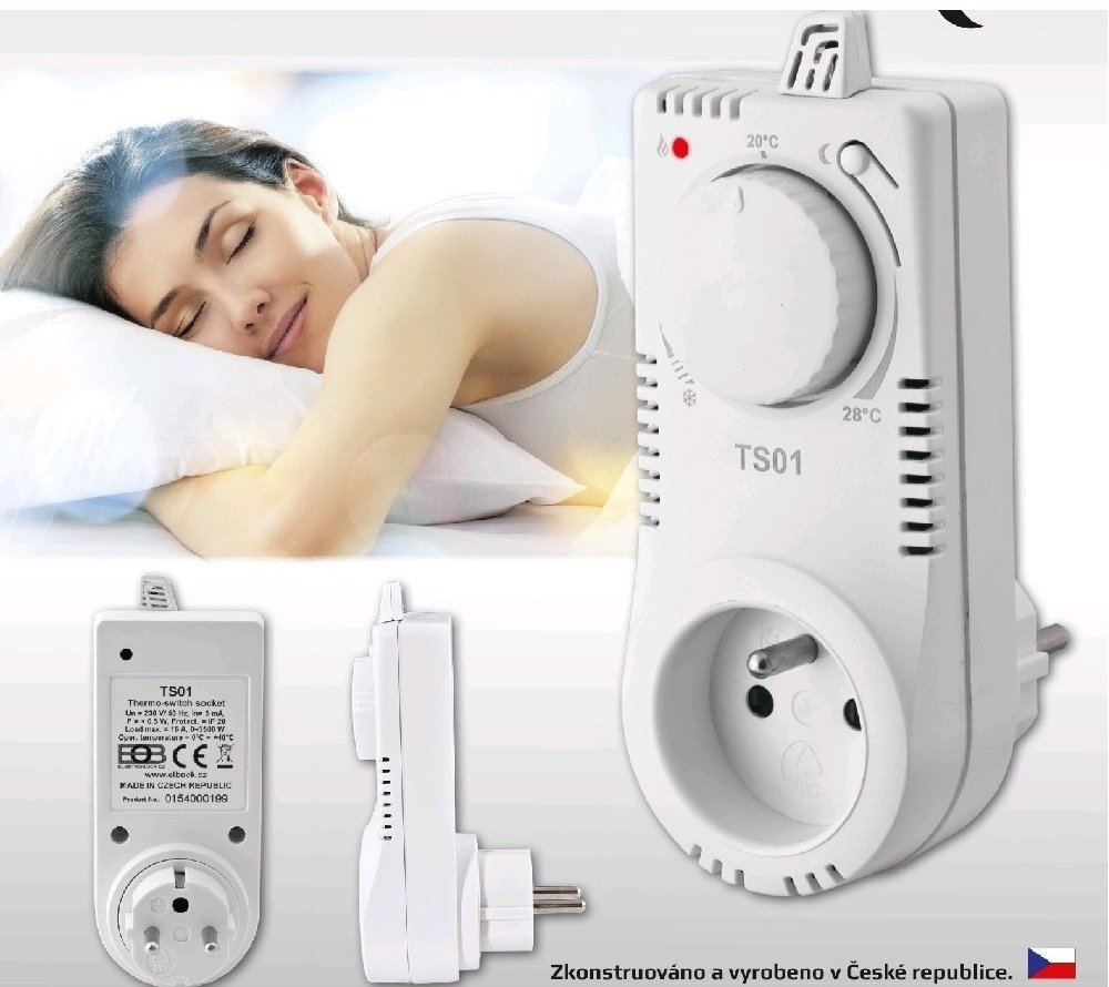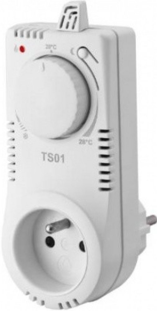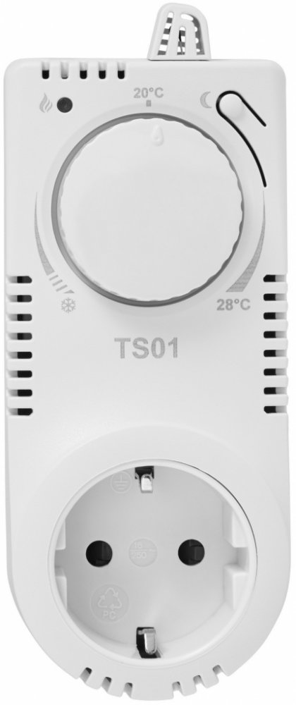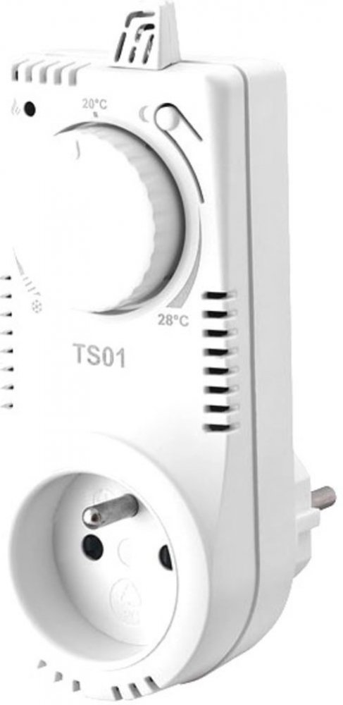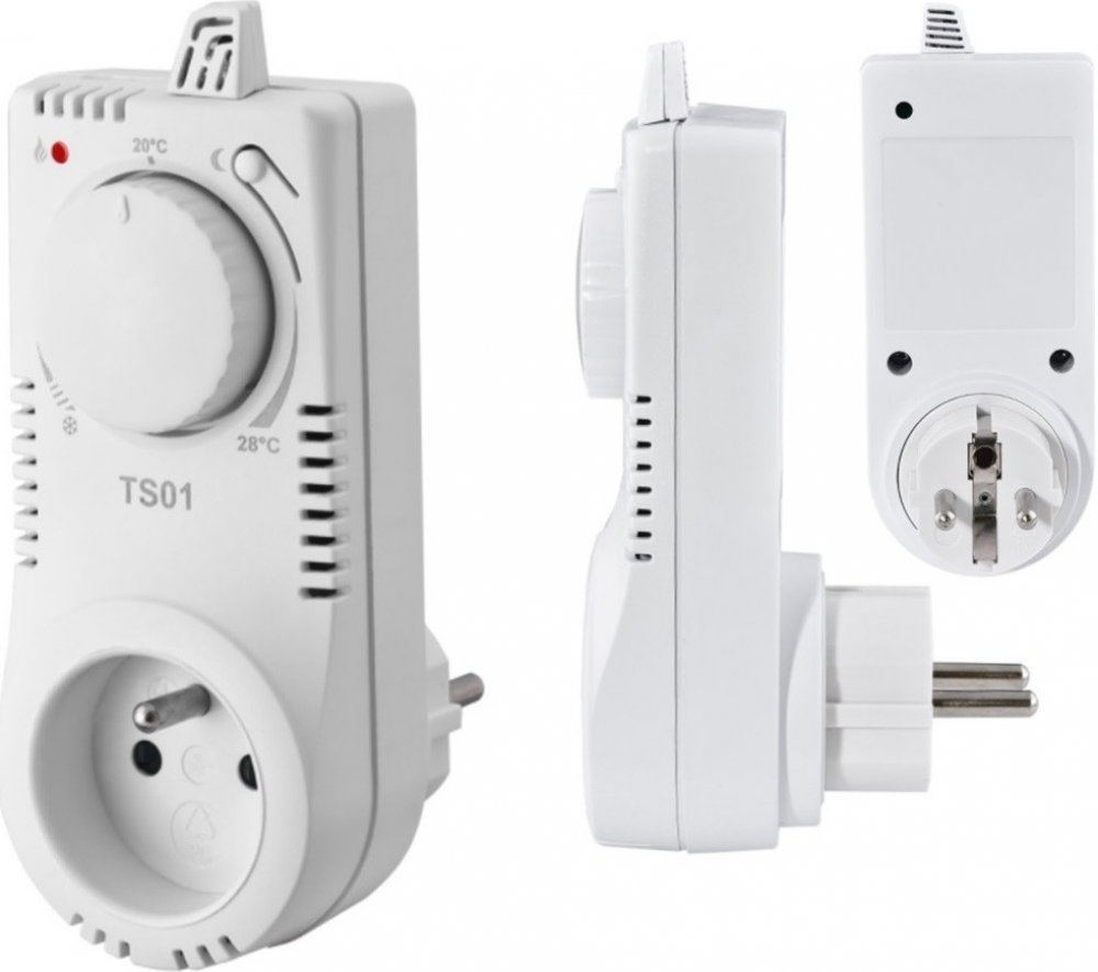 Jste příznivcem jednoduchých zařízení, u kterých nemusíte přemýšlet jak je nastavit? TS01 je právě pro Vás! Tepelně spínaná zásuvka měří teplotu v místnosti a ovládá připojený spotřebič podle Vašich požadavků. TS01 zapojíte do zásuvky, zapojíte spotřebič, který chcete ovládat, otočíte kolečkem na žádanou teplotu a vše je hotovo.Napadla Vás však zásadní otázka: "Jak zajistím automatický noční útlum každý den? To musím stále točit kolečkem?NE, NE! Noční útlum u TS01 aktivujete stisknutím tlačítka se symbolem měsíčku. Snížíte tak požadovanou teplotu o 3 °C na dobu 8 hodin od stisknutí tohoto tlačítka (více informací naleznete v přiloženém letáku).Výhody TS01: