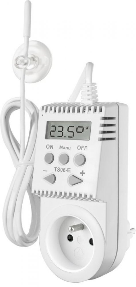 ELEKTROBOCK TS06E; Tepelně spínaná zásuvka s externím čidlem a jednoduchým ovládáním pro regulaci elektrických topných soustav jako jsou přímotopy, infrapanely či topné žebříky.